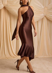 Unique Chocolate One Shoulder Ice Silk Wraped Dress Summer