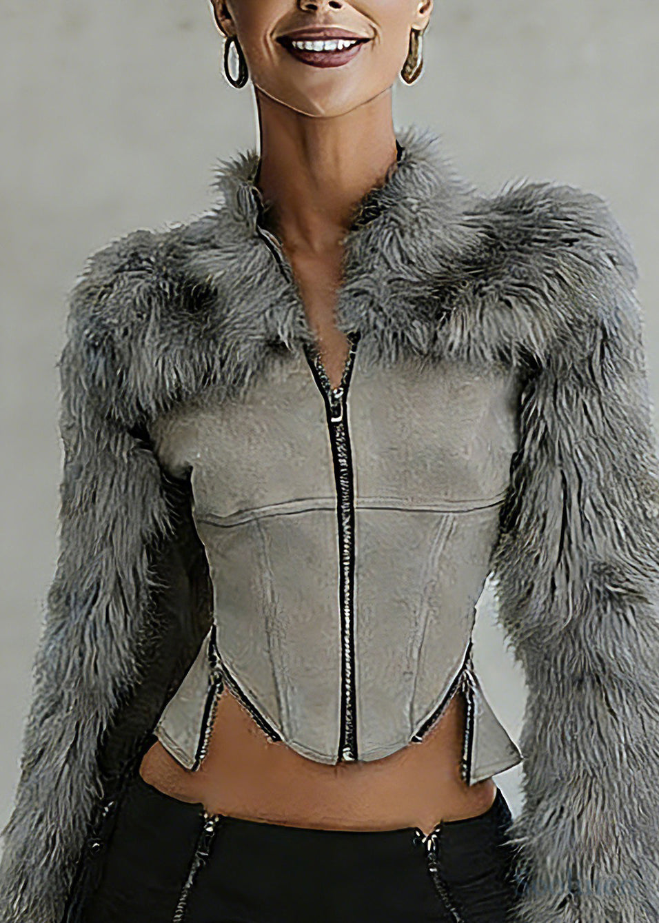 Chic Grey Fur Collar Zippered Faux Suede Patchwork Coats Spring