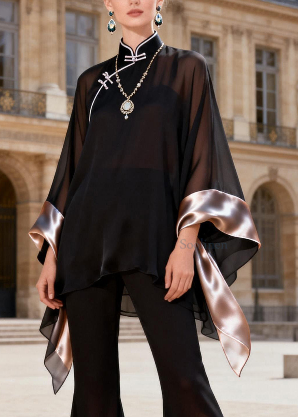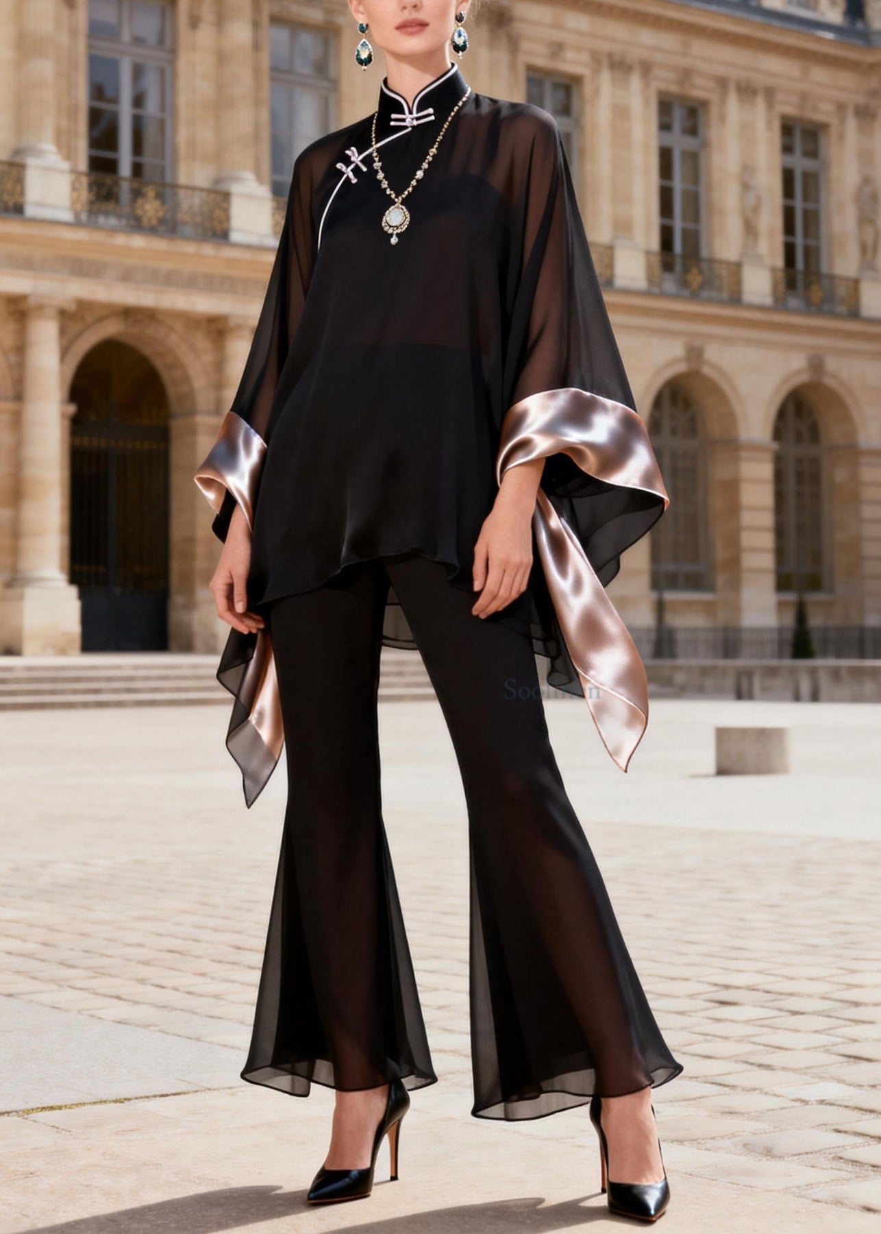 Chinese Style Black Stand Collar Patchwork Silk Two Piece Set Outfits Summer