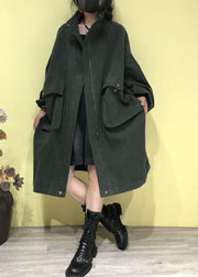 Plus Size Green Stand Collar Zippered Pockets Trench Coats Fall