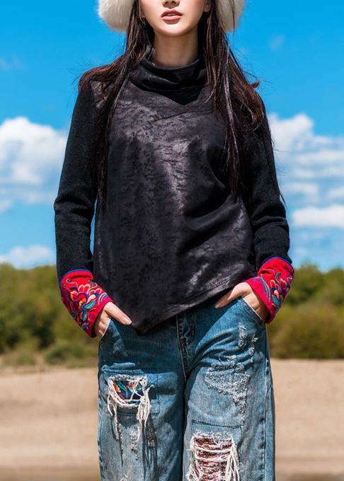 Classy black cotton tunic top asymmetric Dresses patchwork sleeve blouses - SooLinen