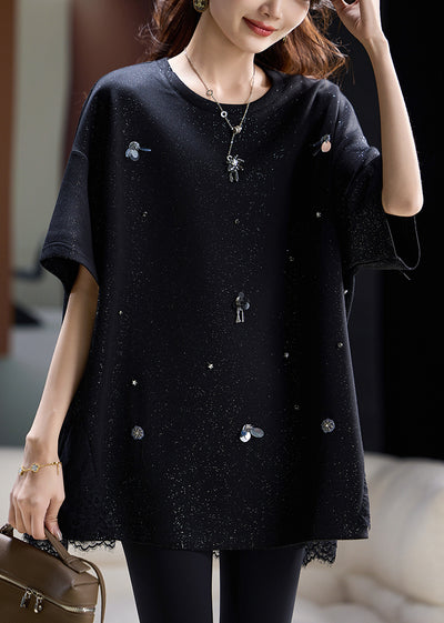 Natural Black Hooded Lace Patchwork Cotton Pullover Sweatshirt Fall