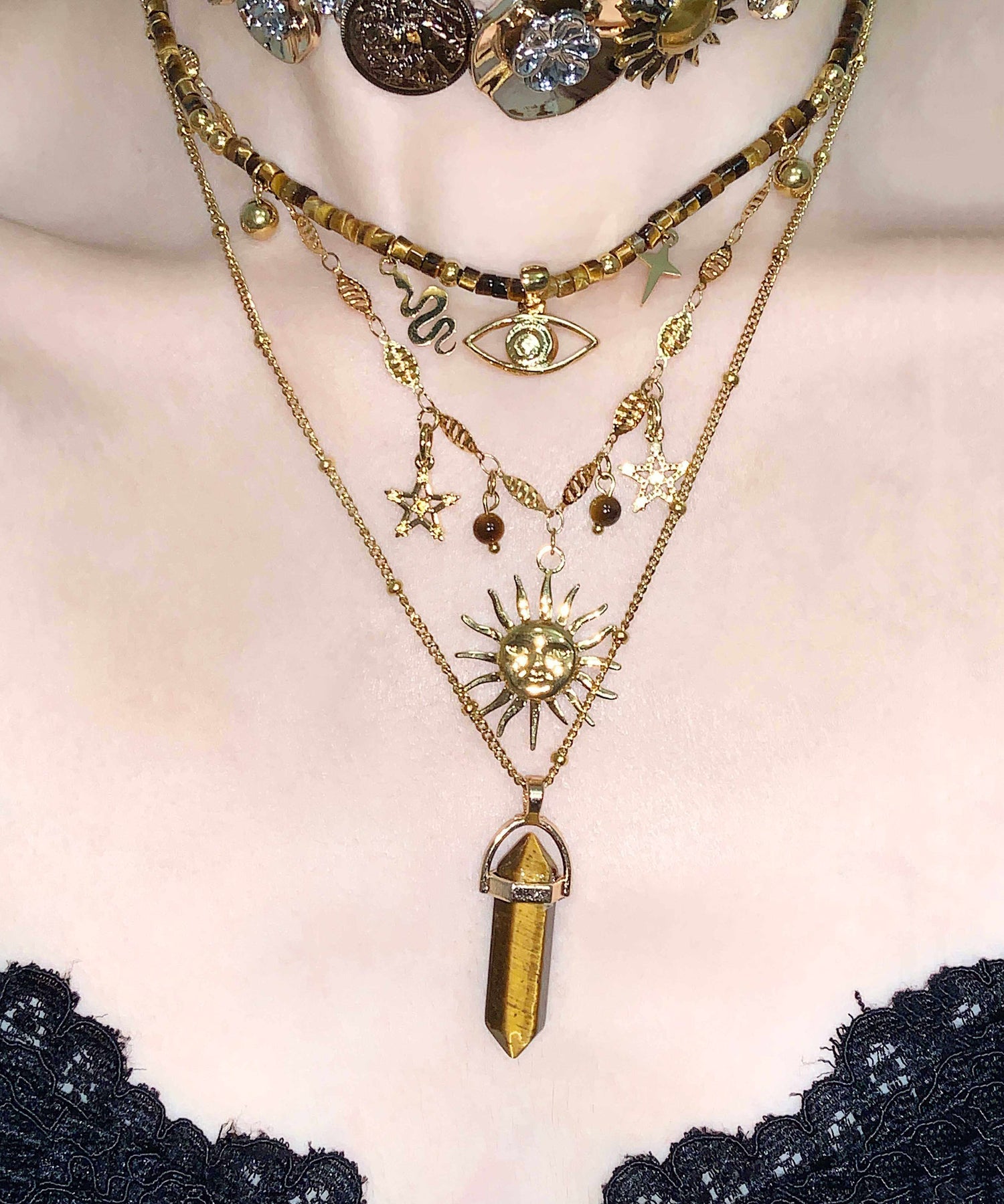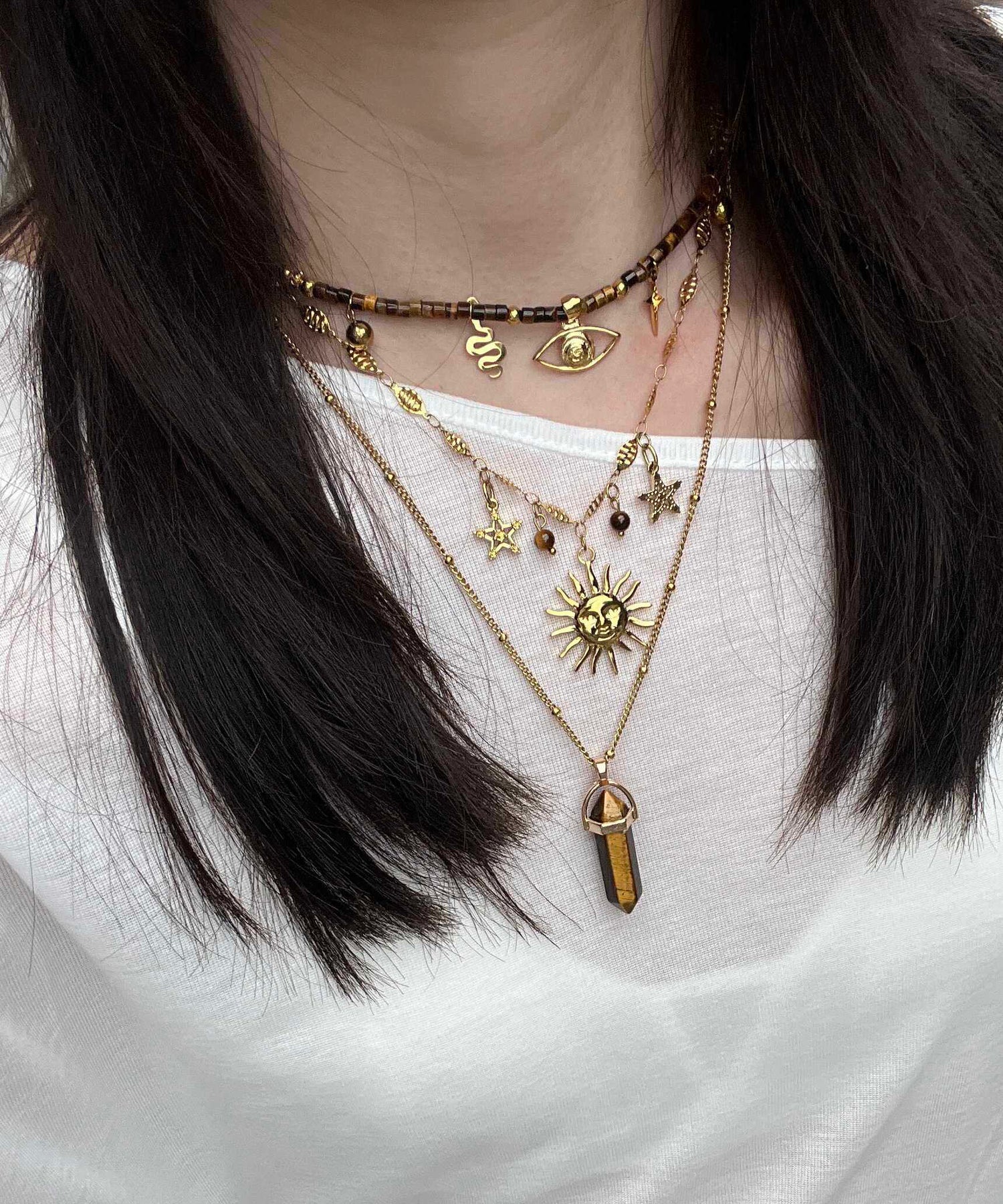 Brown Tiger's Eye Long Column Sun Layering Titanium Steel Four Piece Set Pendant Necklace