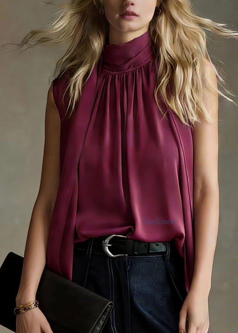 French Purple Ribbon Pleated Silk Top Sleeveless