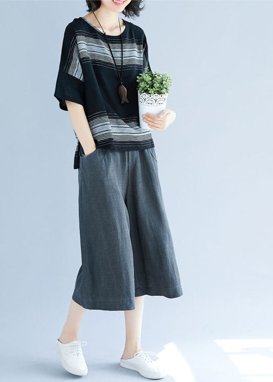 Women Black Oversized Striped Cotton Tanks Short Sleeve