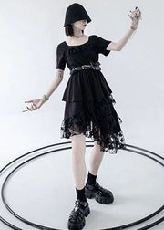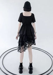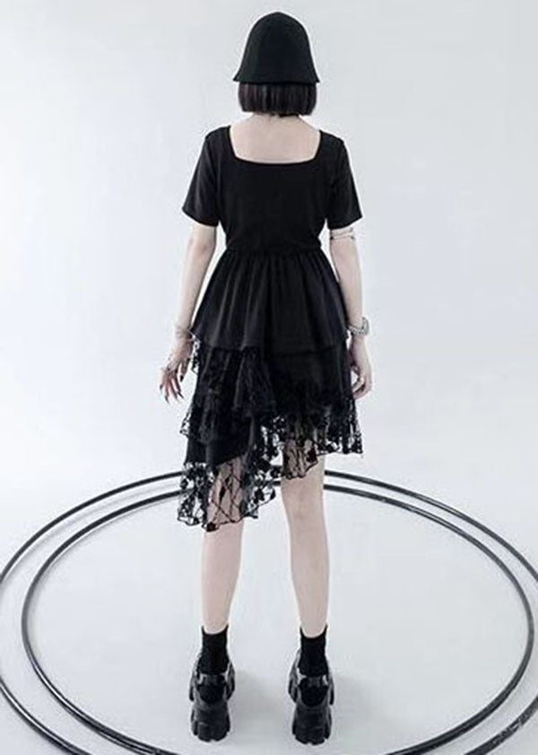 Schwarzes Patchwork-Tüll-Baumwoll-Kuchenkleid mit O-Ausschnitt, asymmetrisch, halbe Ärmel