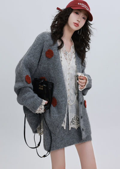 French Grey Oversized Flower Decorated Knit Loose Jacket Winter