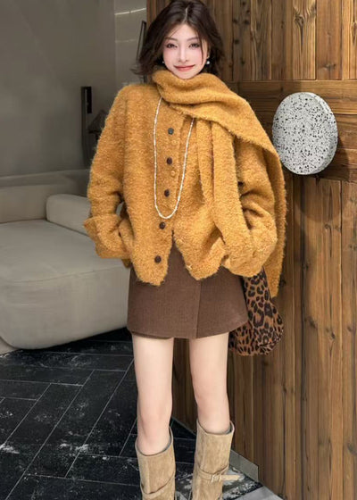 Fitted Orange Oversized Thick Wool Knit Cardigan Winter