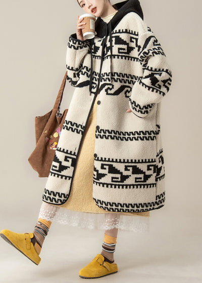 French White Print Button Loose Faux Fur Hooded Coat Winter