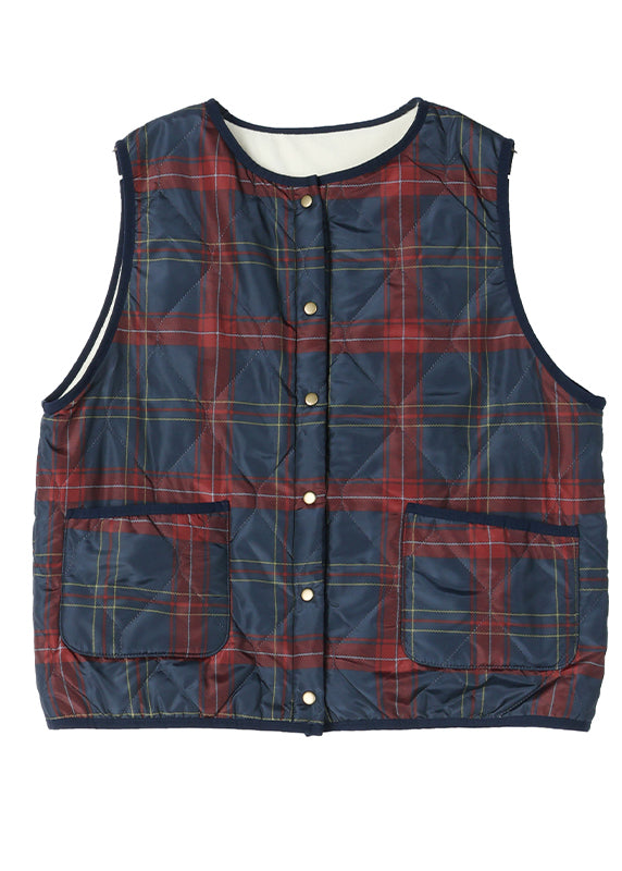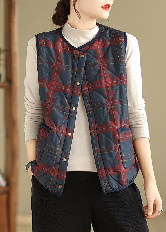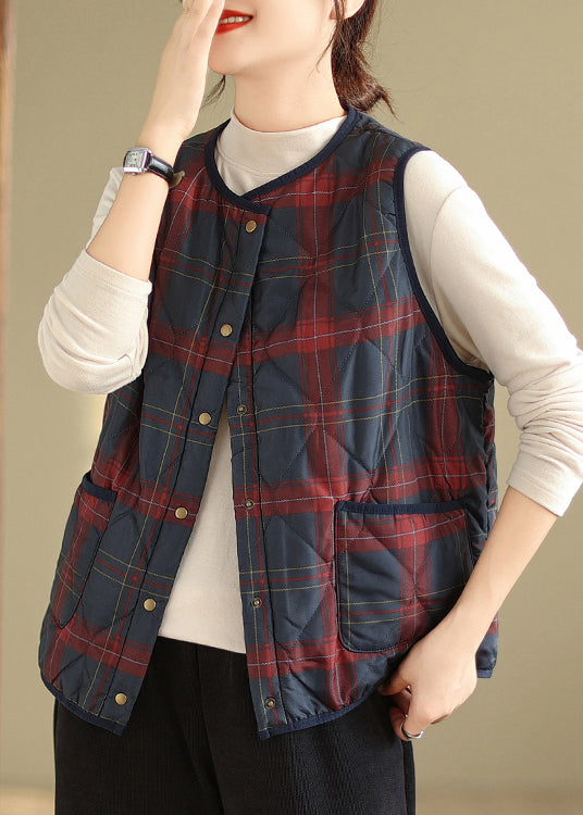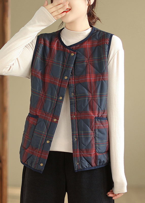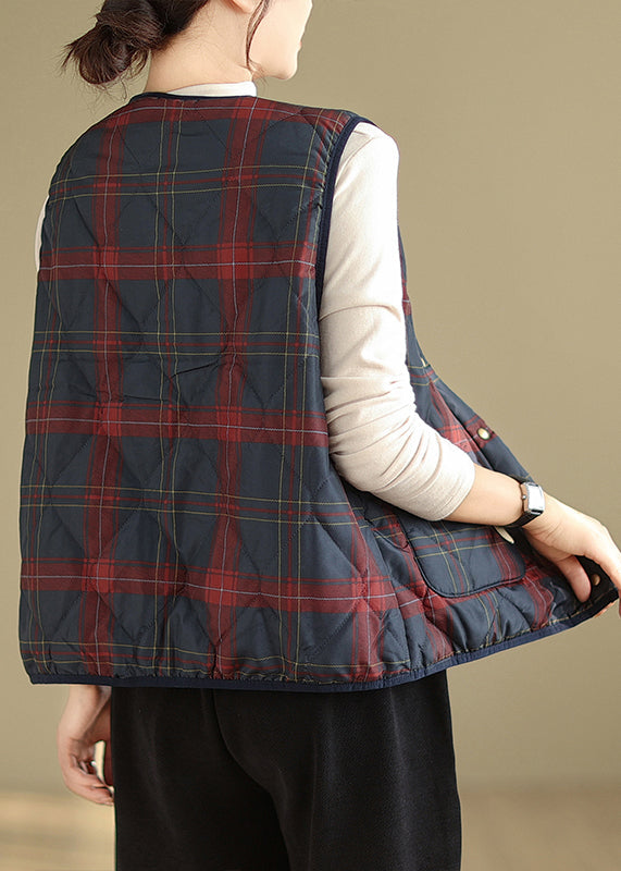 Women Red Navy Plaid Pockets Patchwork Warm Fleece Vest Sleeveless