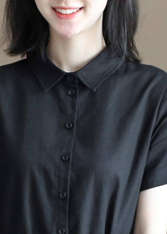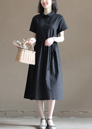 Plus Size Solid Black Kordelzug Bubikragen Knopf Baumwolle Leinen Hemdkleid Kurzarm