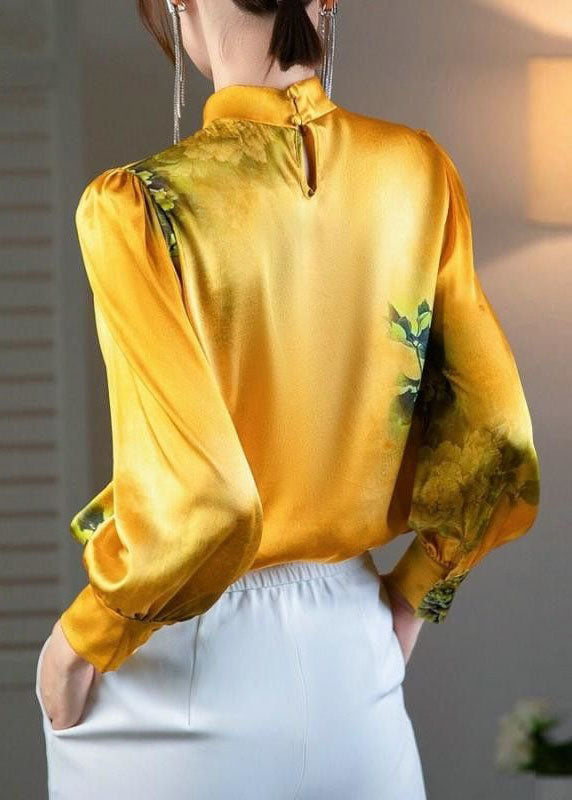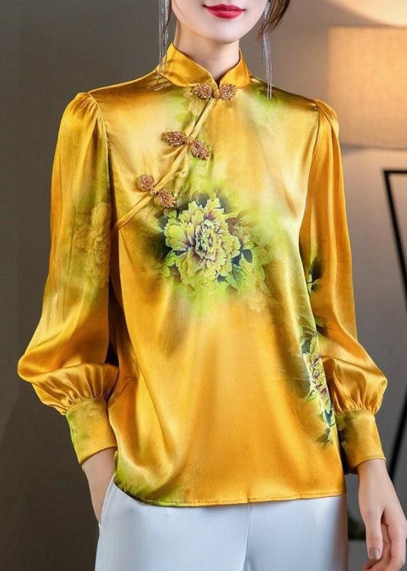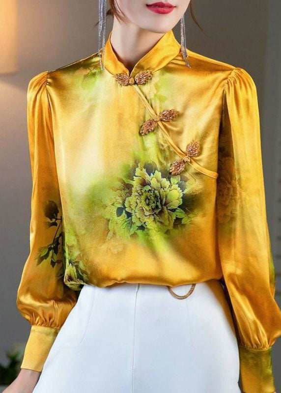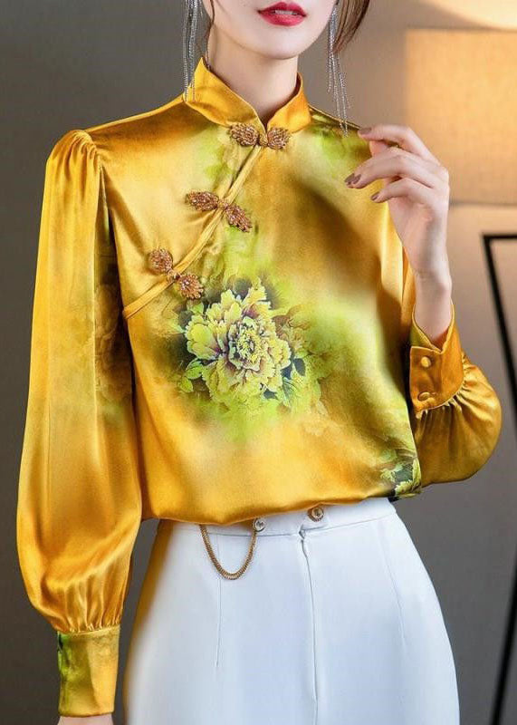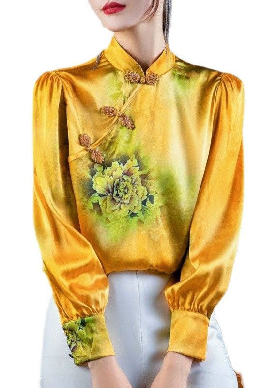 Women Yellow Stand Collar Oriental Button Print Patchwork Silk Tops Spring