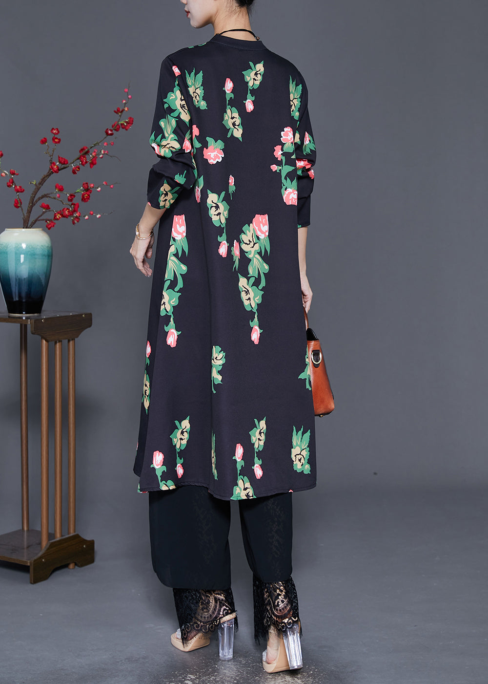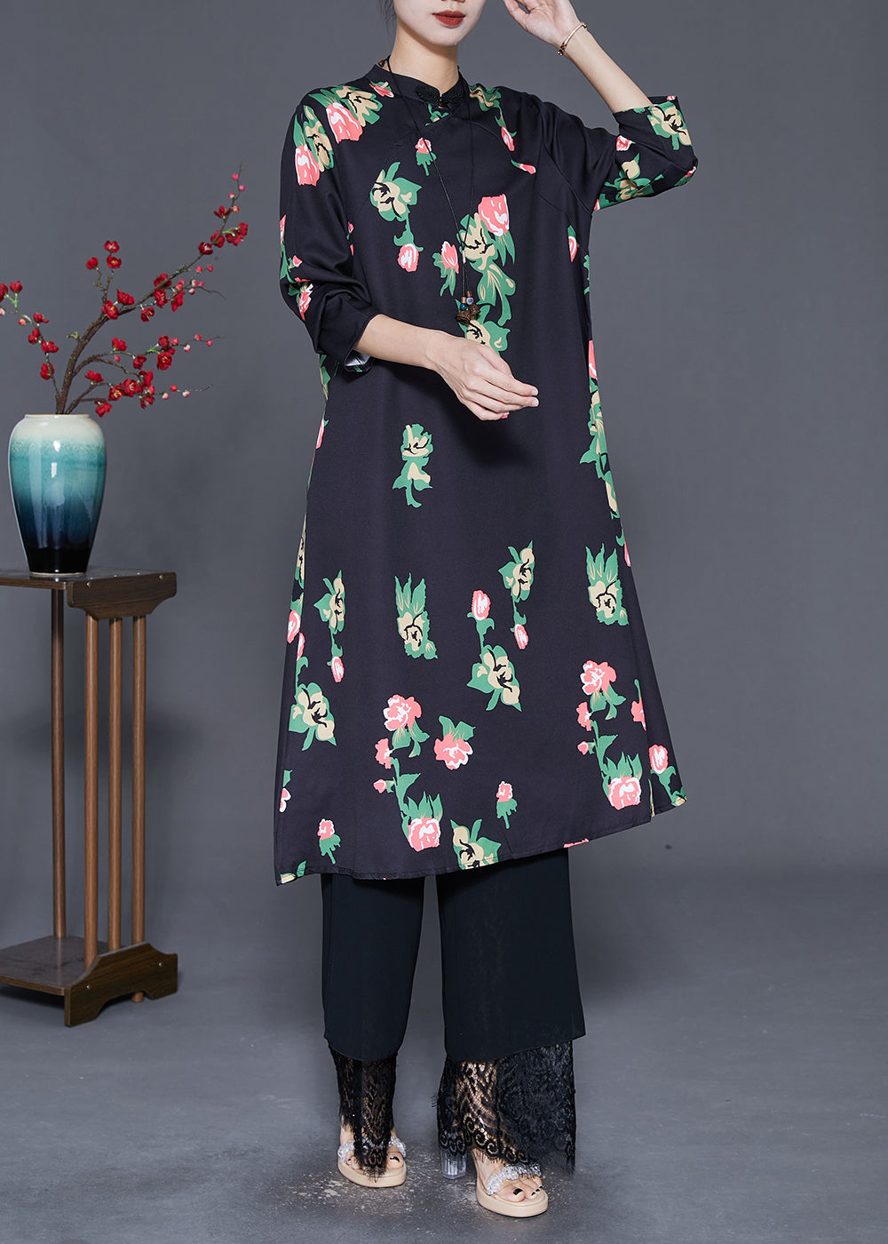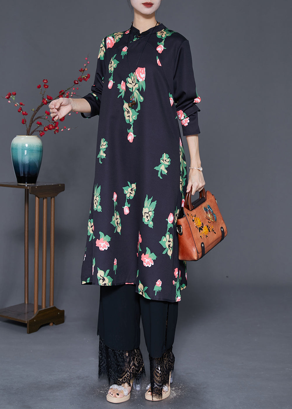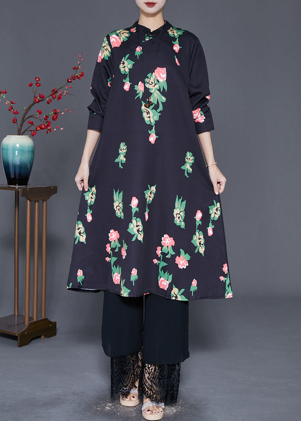 Elegant Black Mandarin Collar Print A Line Dress Fall