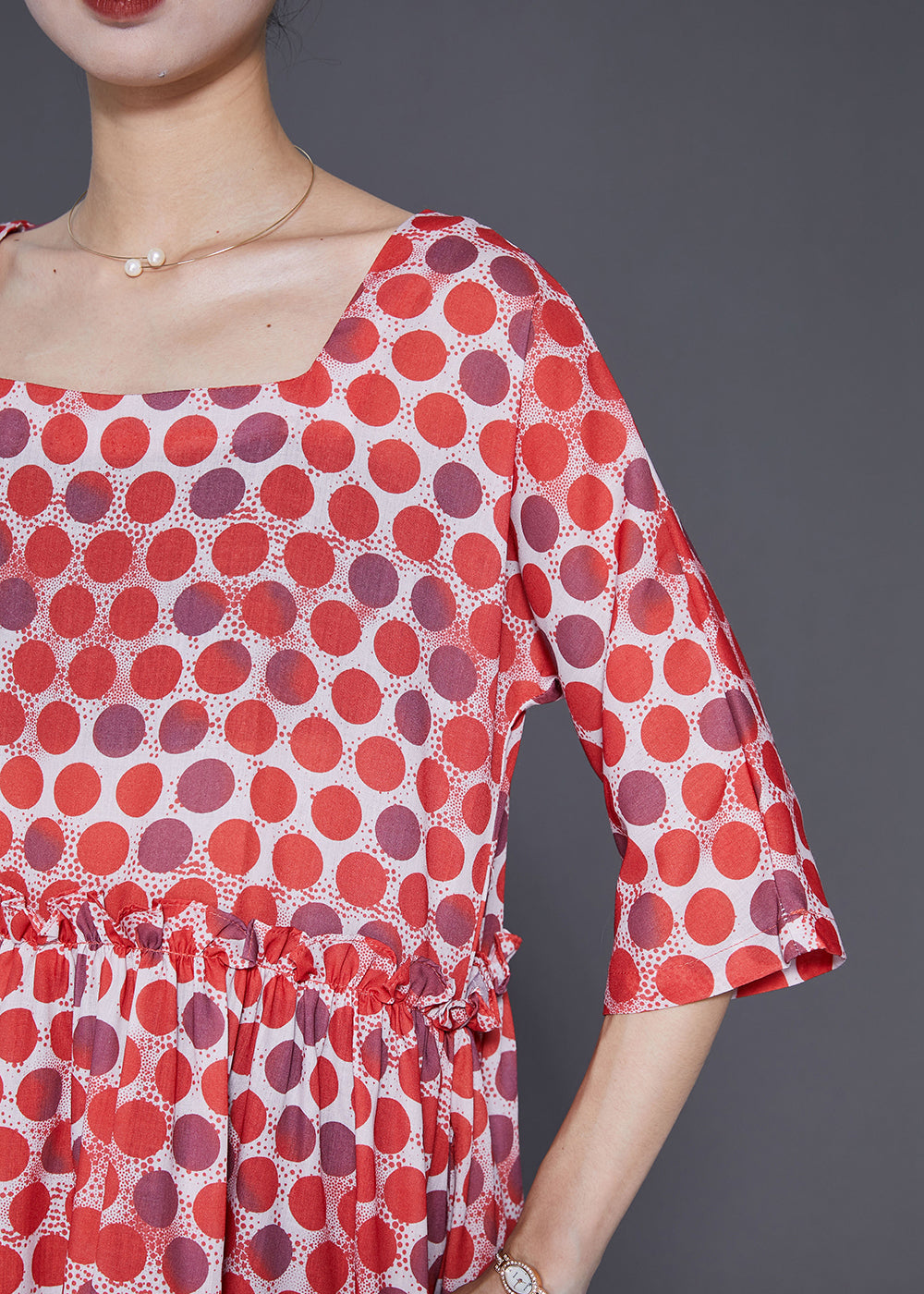 Elegant Red Square Collar Ruffled Print Robe Dresses Half Sleeve