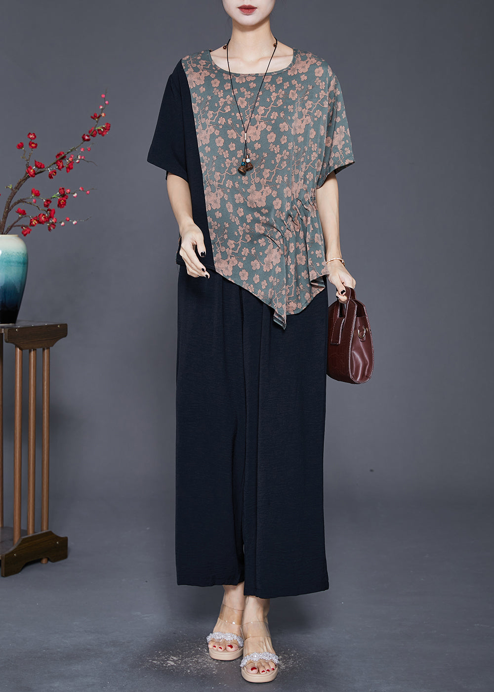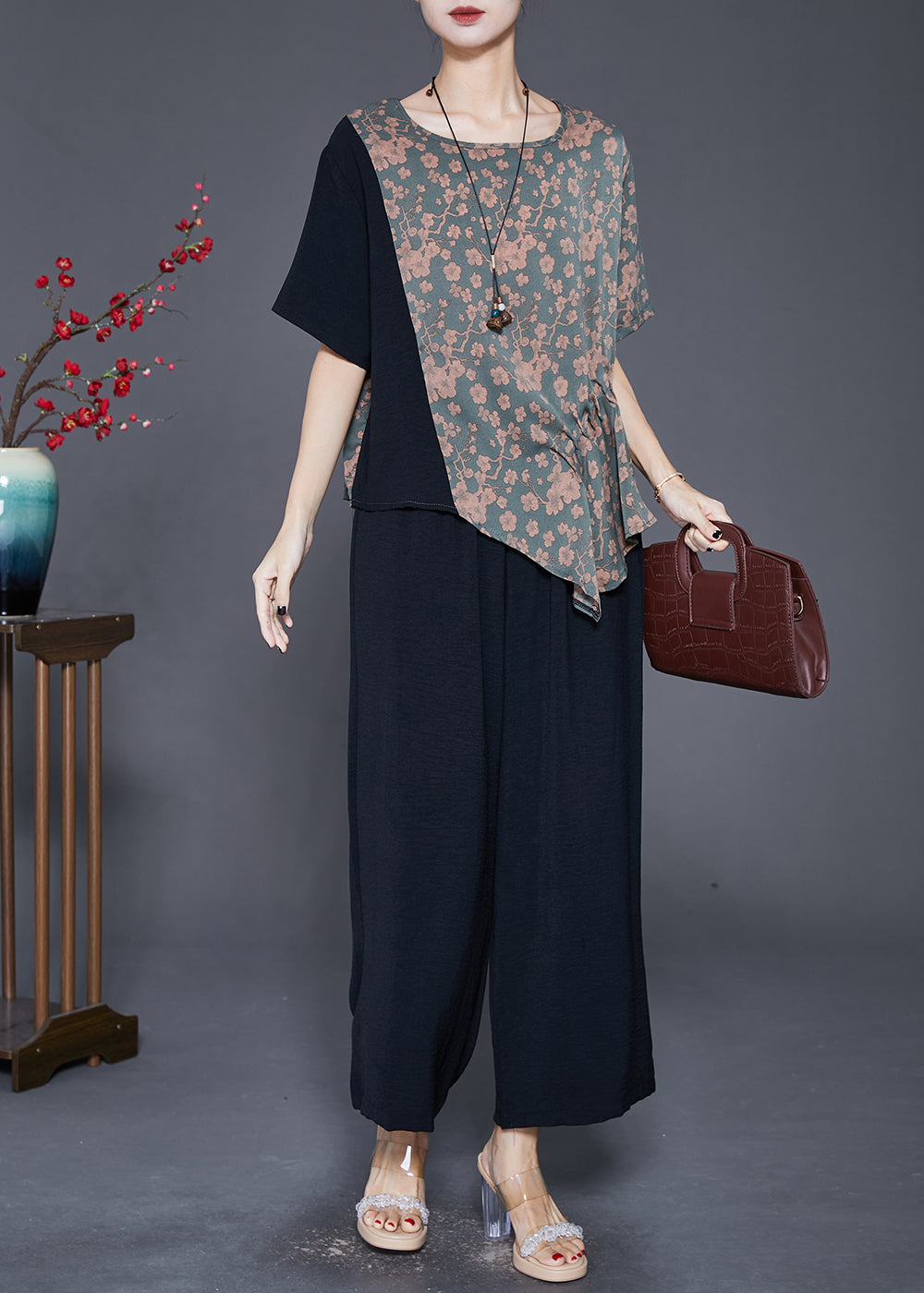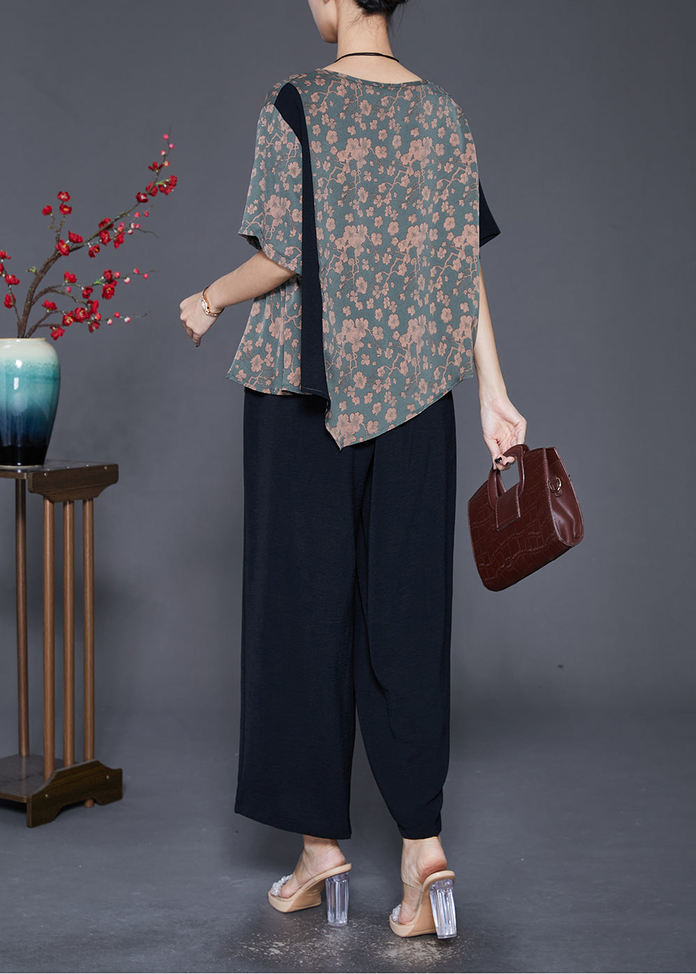 Women Asymmetrical Patchwork Print Silk Two-Piece Set Fall