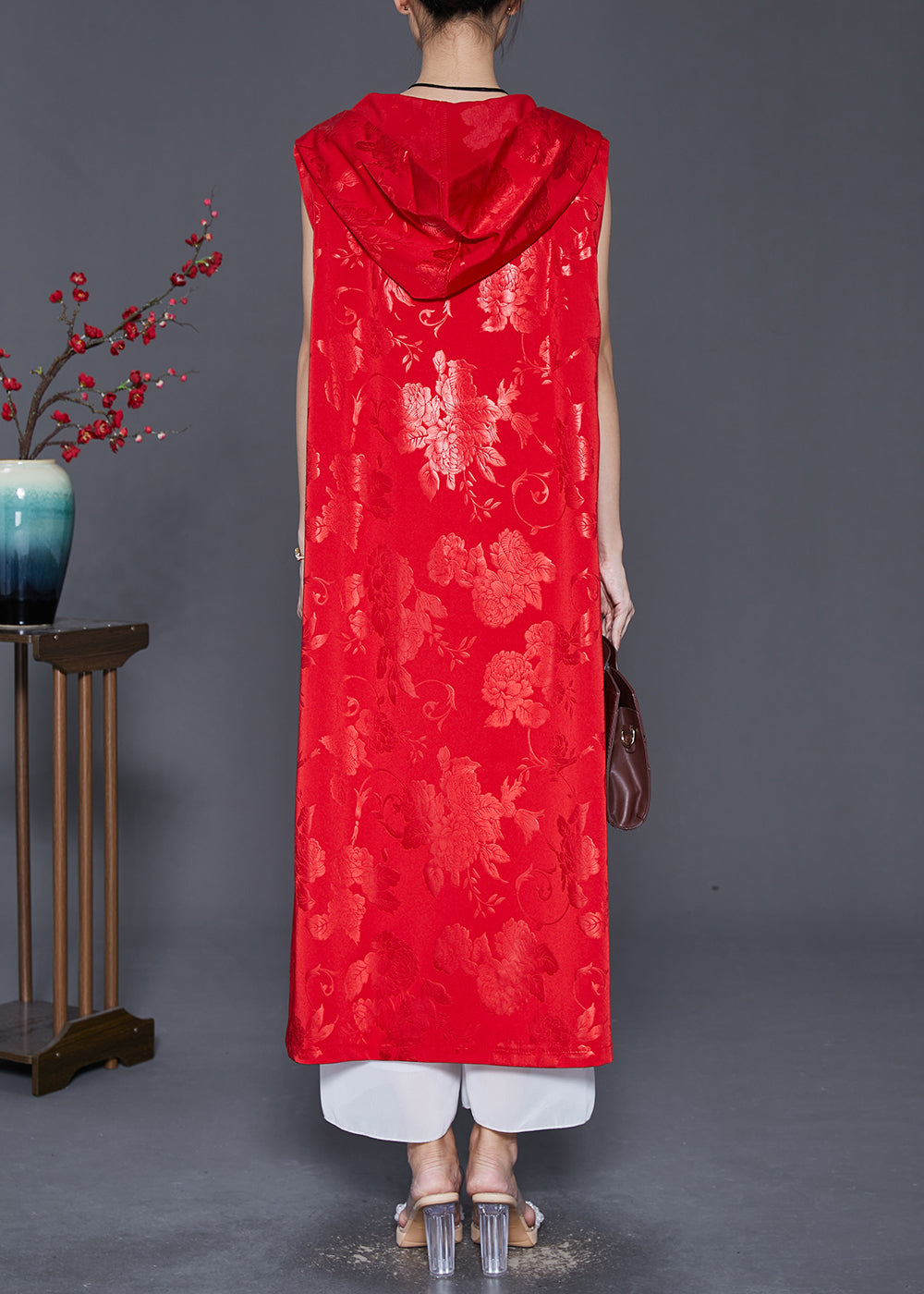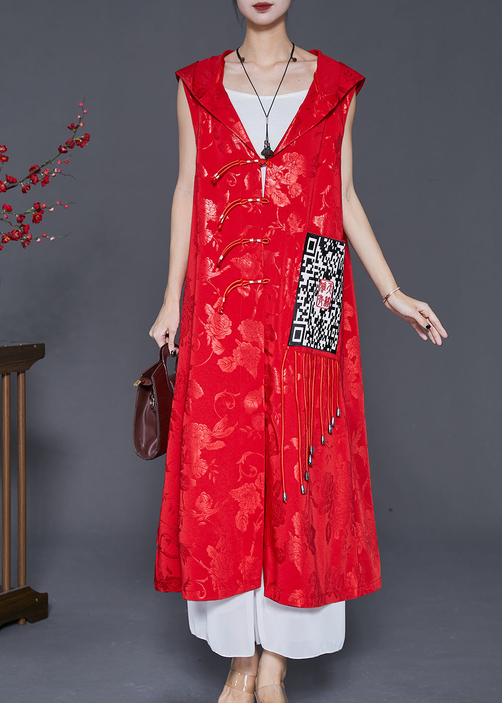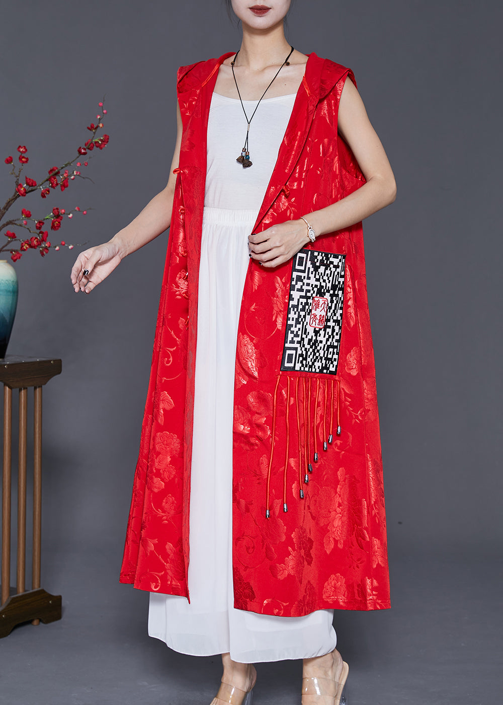 Women Red Jacquard Tasseled Silk Long Vest Fall