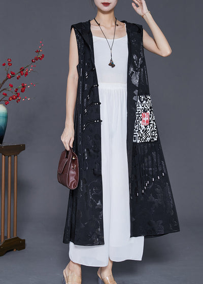 Art Black Hooded Embroideried Silk Long Vest Fall