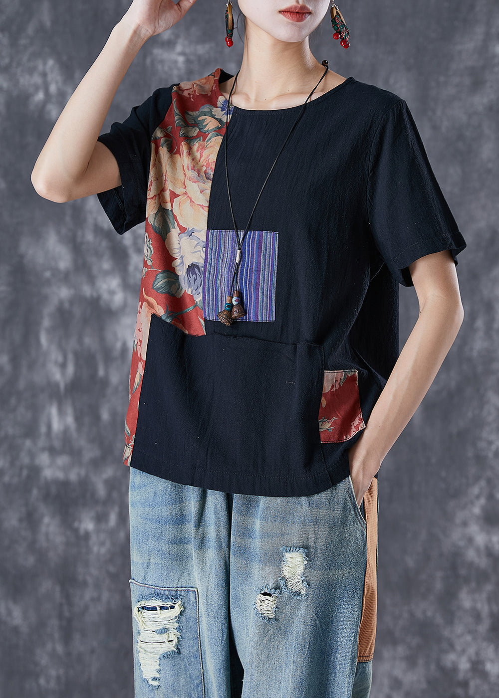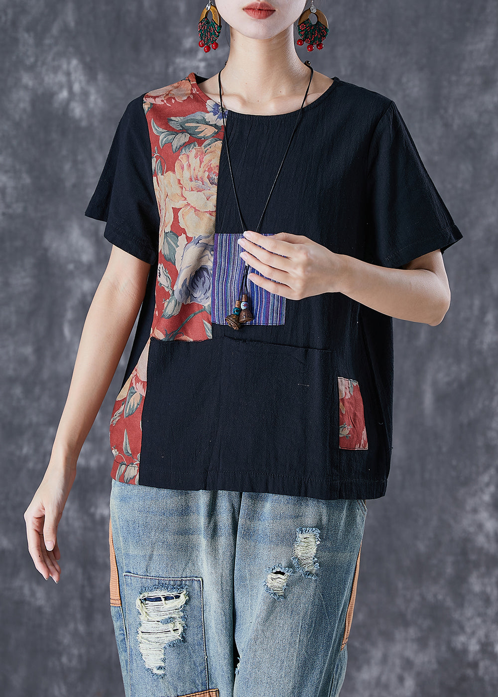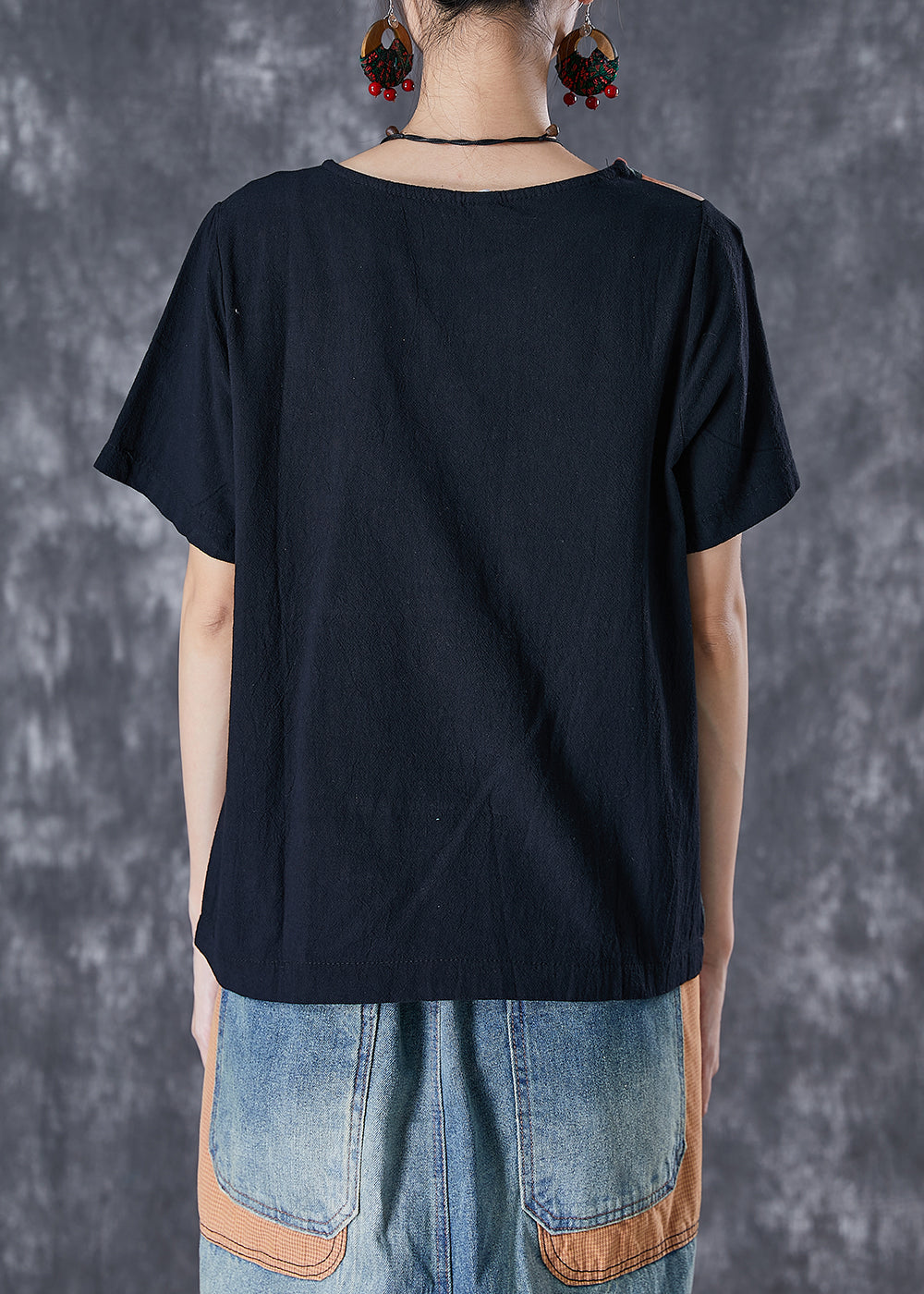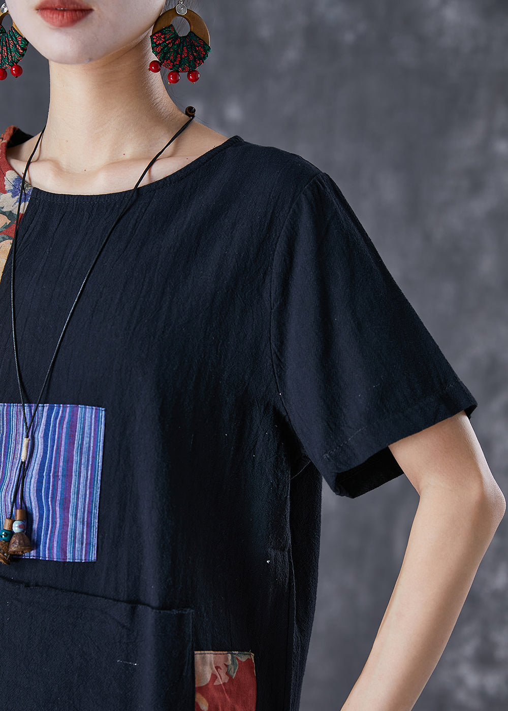 Boho Black Oversized Patchwork Applique Cotton Tanks Summer