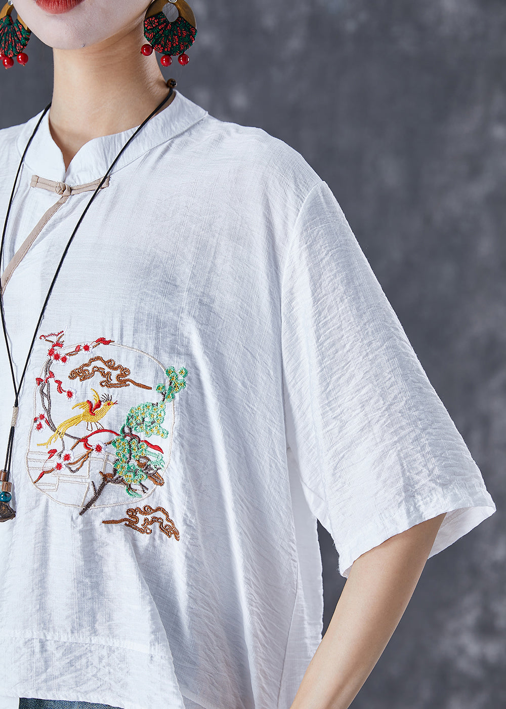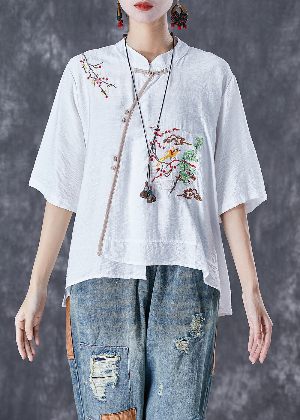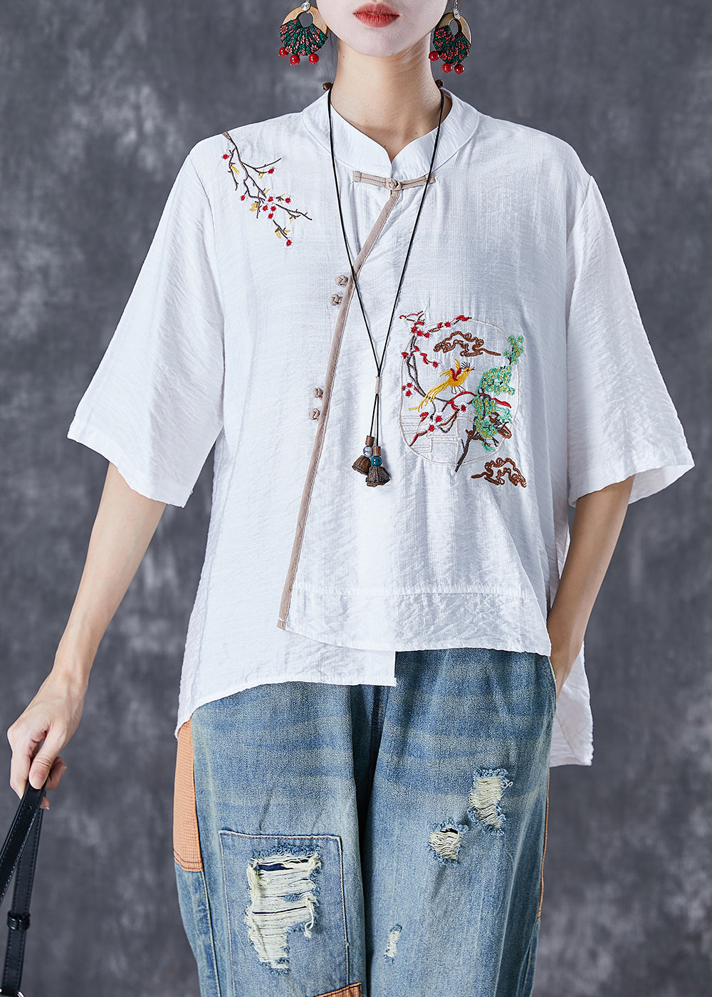 Handmade White Embroideried Patchwork Linen Blouses Summer