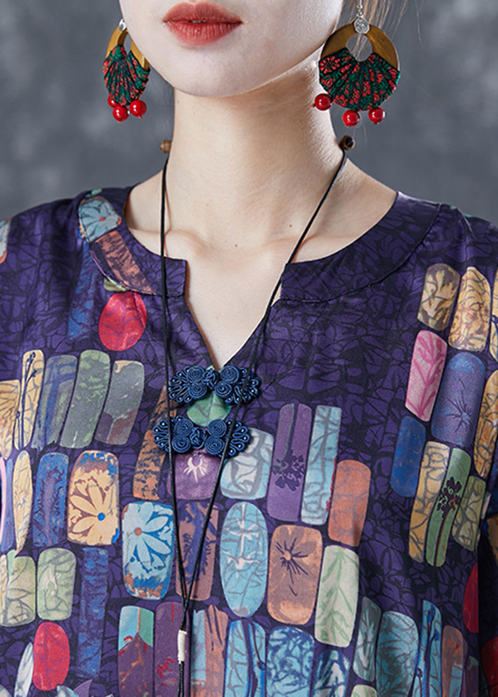 Modern Purple V Neck Print Silk Holiday Dress Summer
