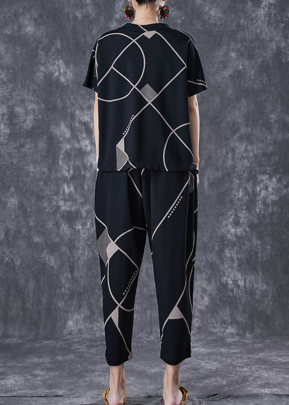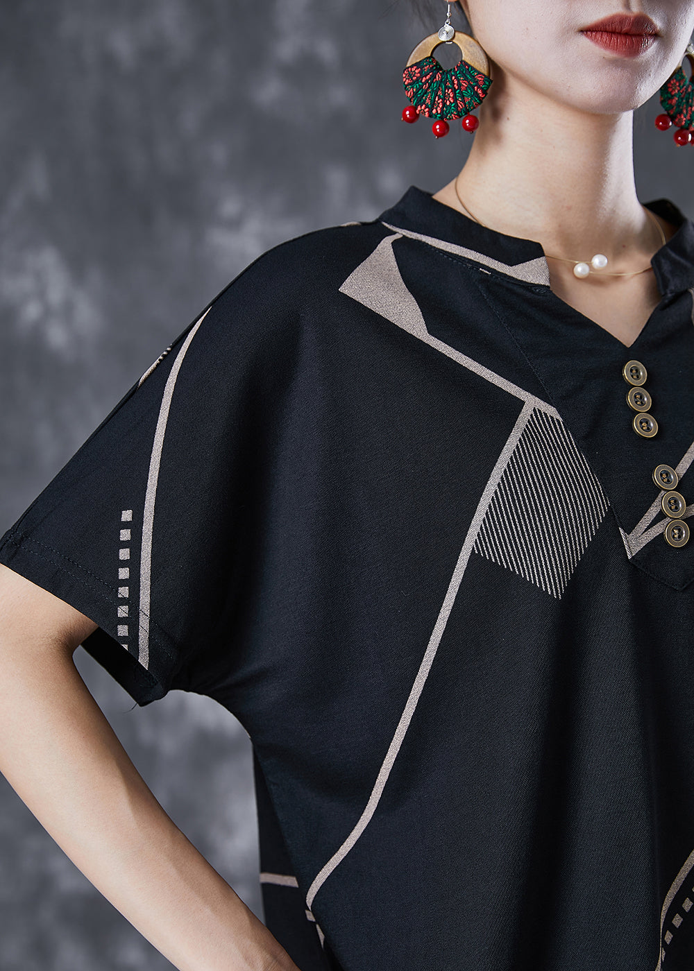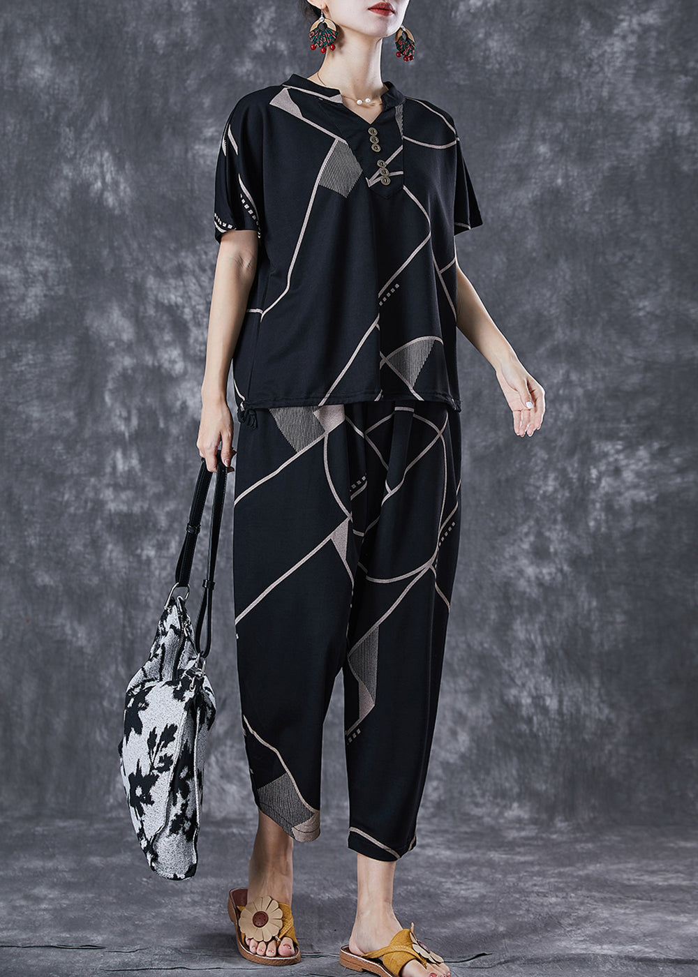 Plus Size Black V Neck Print Button Cotton Two Pieces Set Summer