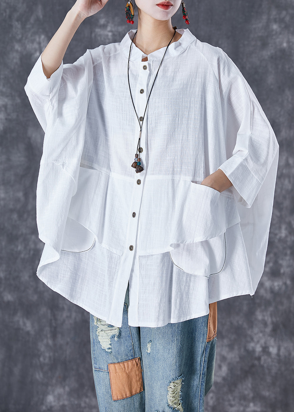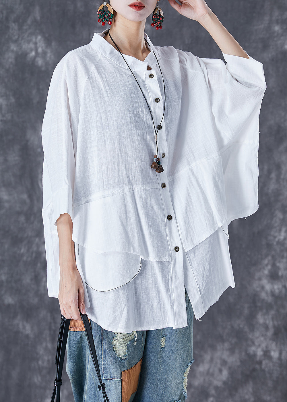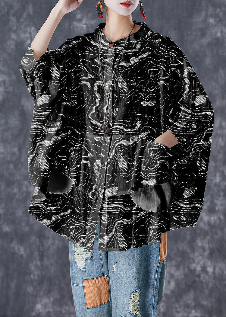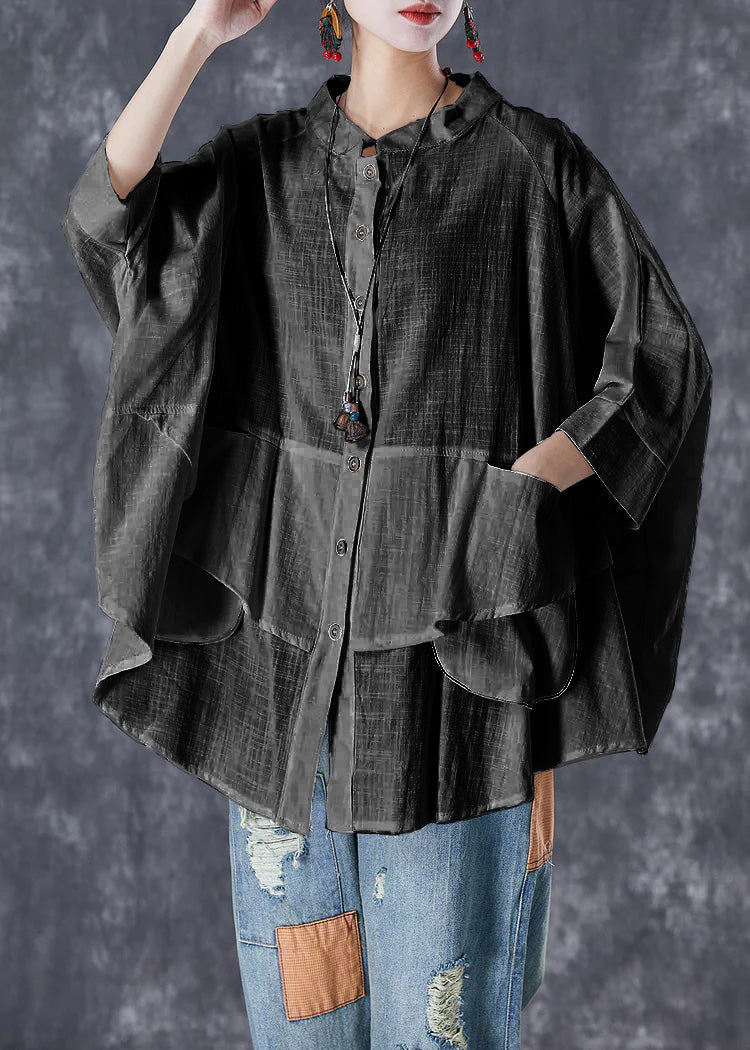 Plus Size Gray-camouflage Stand Collar Patchwork Linen Shirt Tops Batwing Sleeve