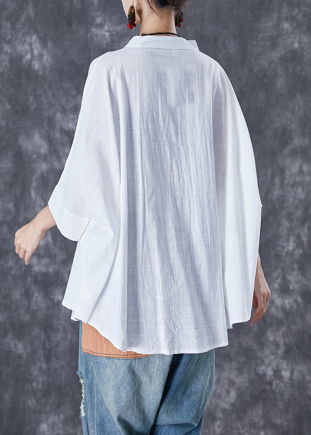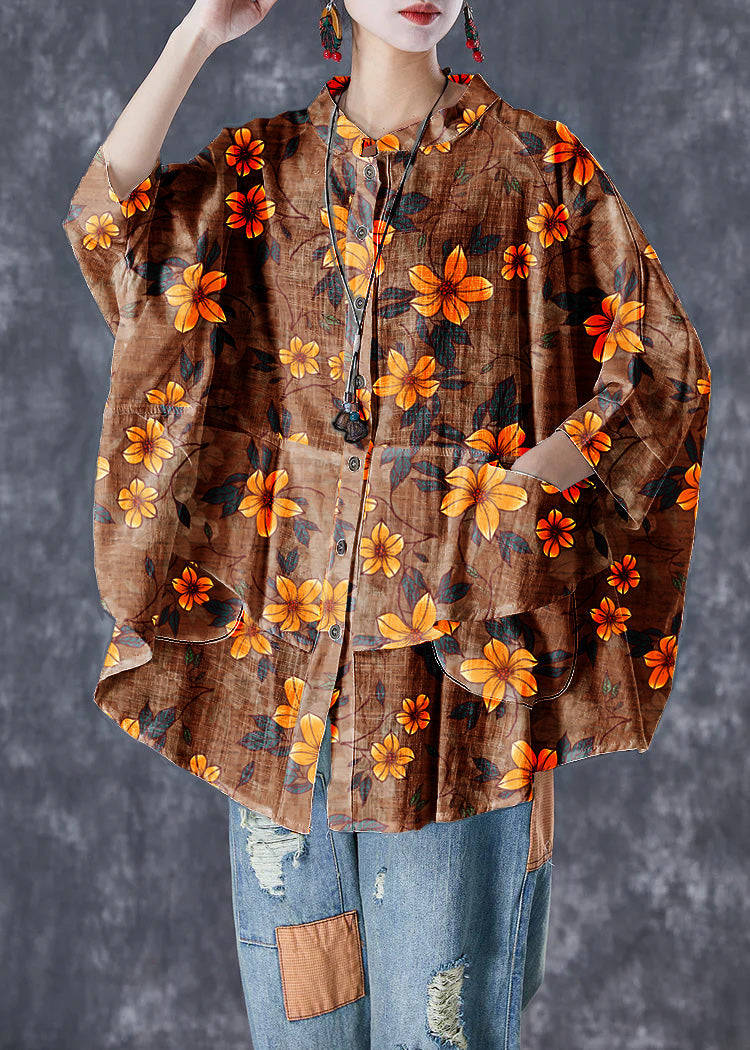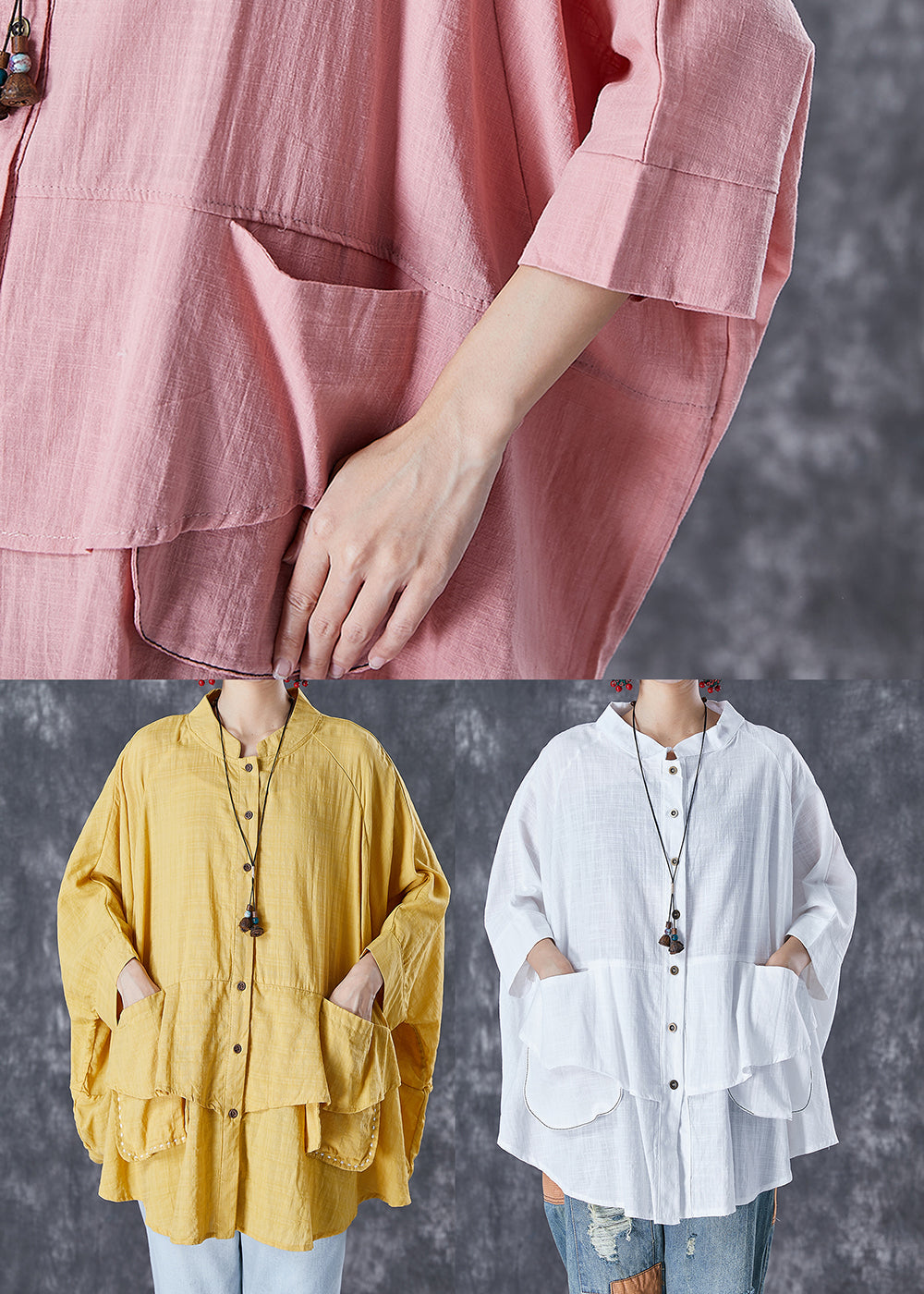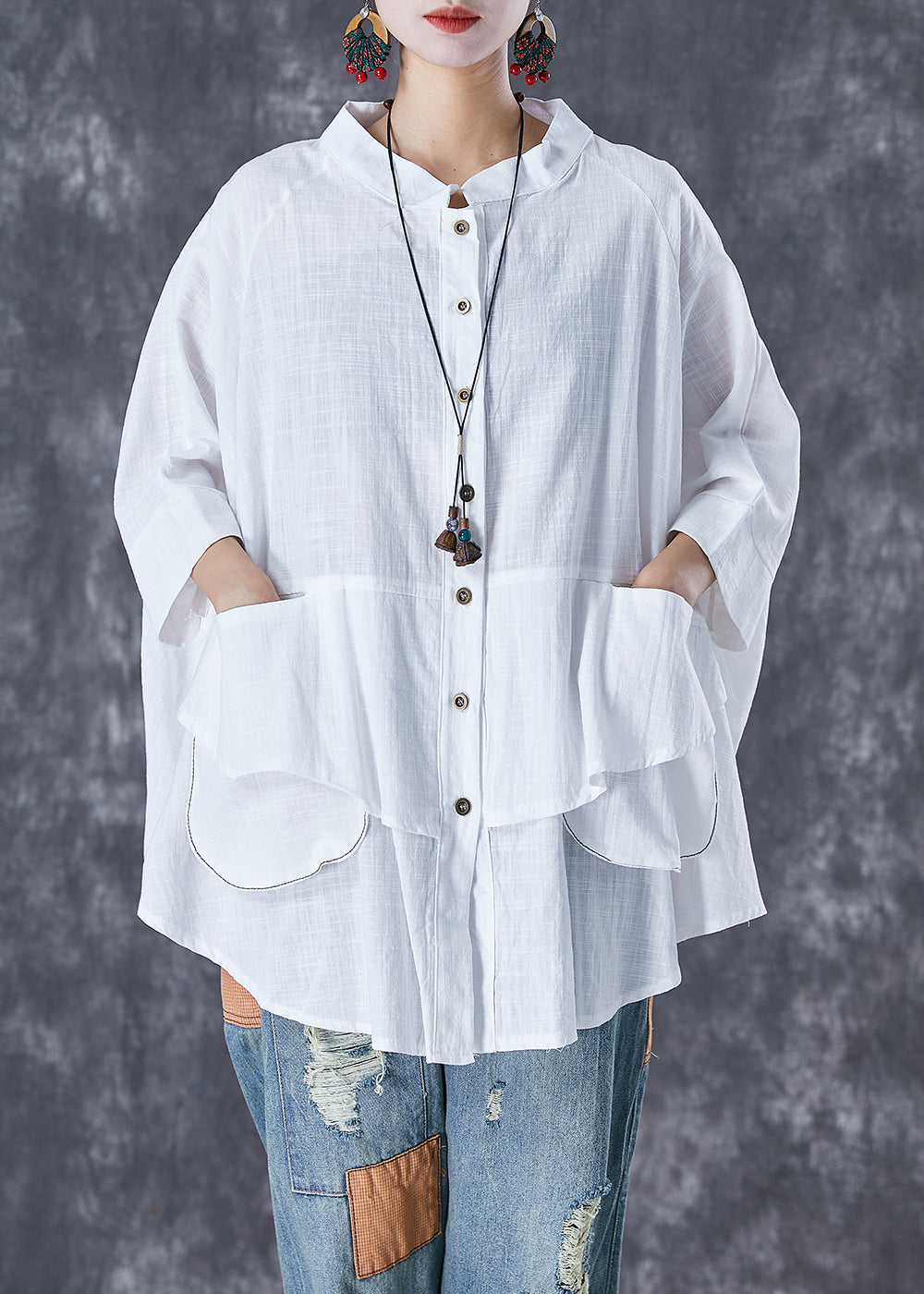 Plus Size Gray-camouflage Stand Collar Patchwork Linen Shirt Tops Batwing Sleeve