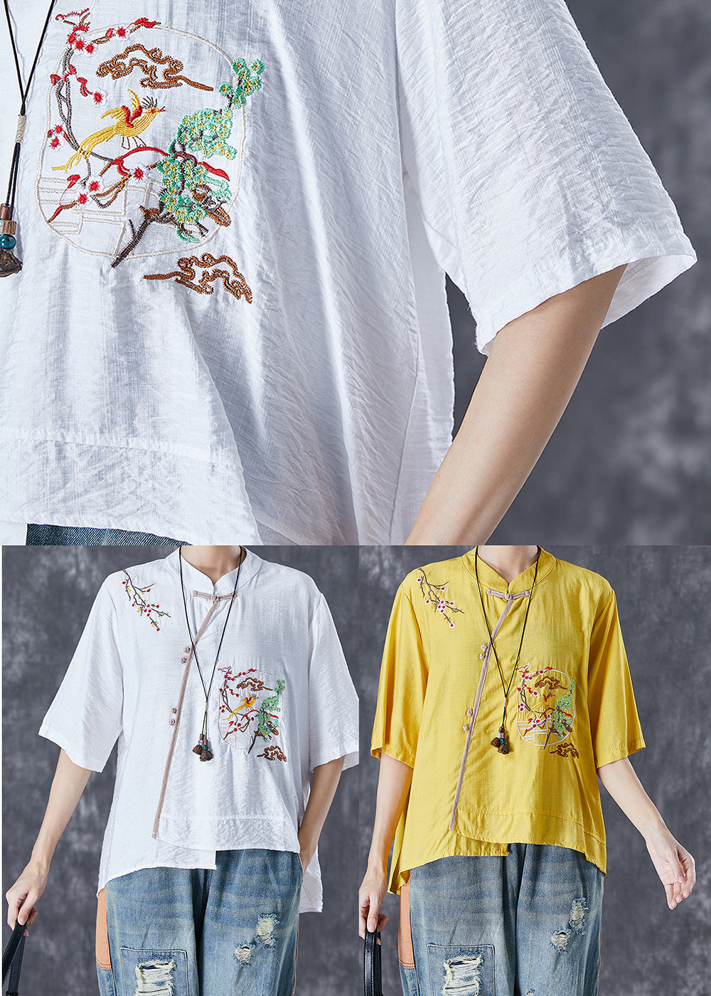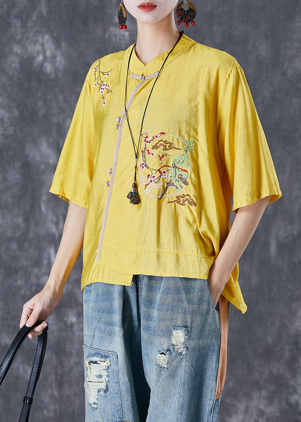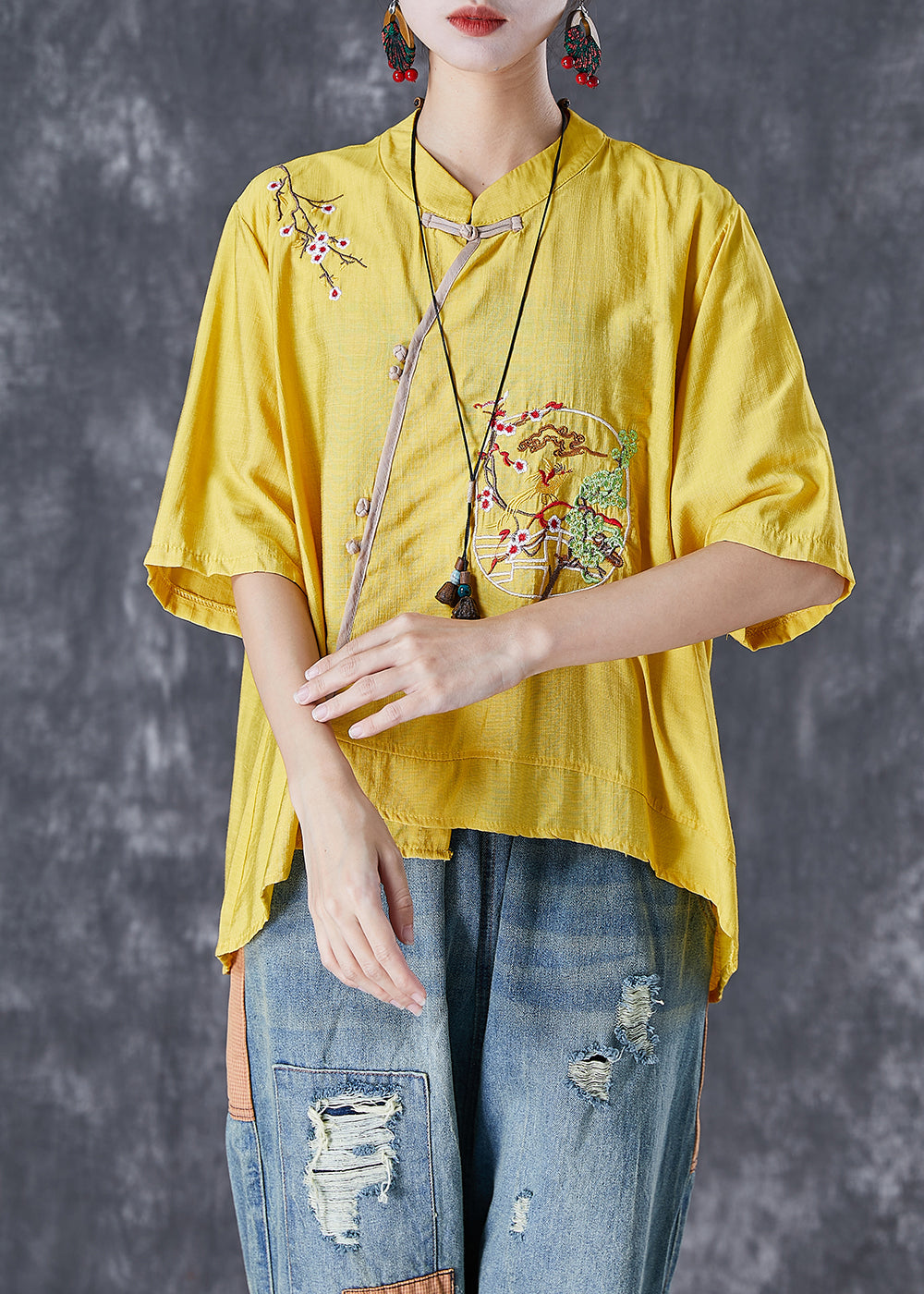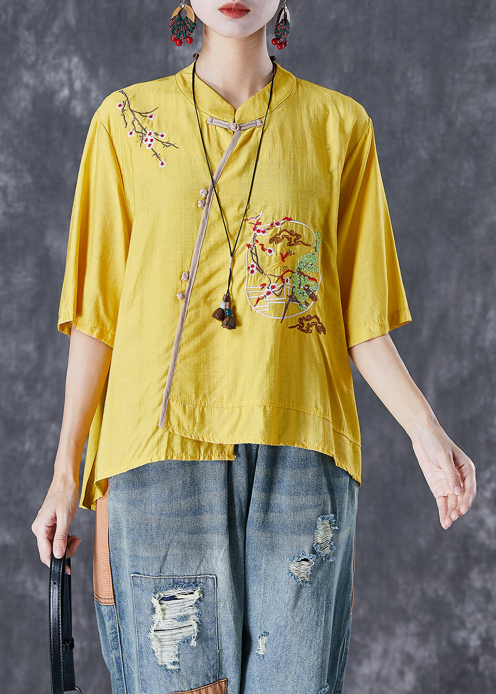 Yellow Asymmetrical Linen Tops Embroideried Chinese Button Summer