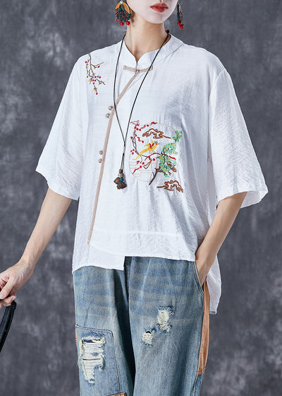 Handmade White Embroideried Patchwork Linen Blouses Summer