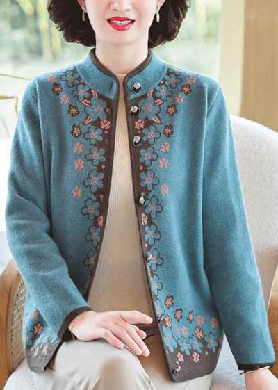 Chinese Style Blue Stand Collar Button Cotton Knit Cardigans Fall