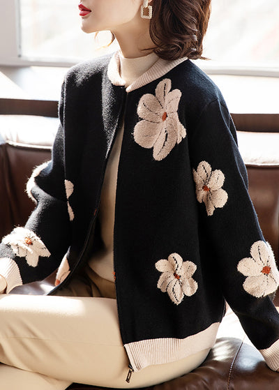 Organic Black O-Neck Print Zippered Cotton Knit Cardigans Fall