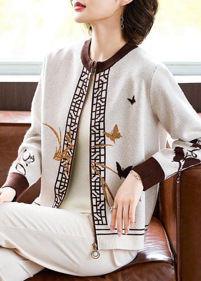 Fine Beige O-Neck Print Cotton Knit Cardigans Fall