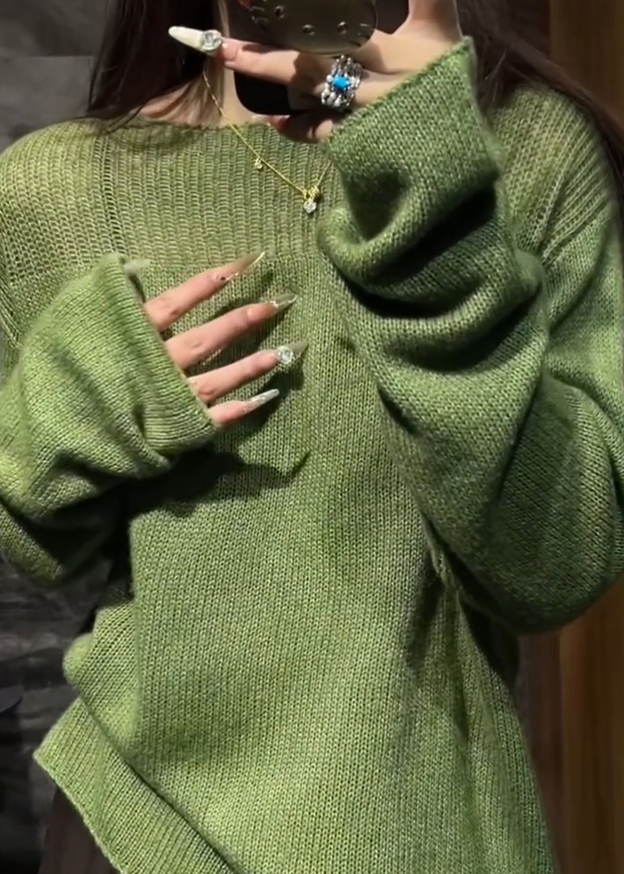 Women Green O Neck Hollow Out Cozy Knit Sweaters Fall