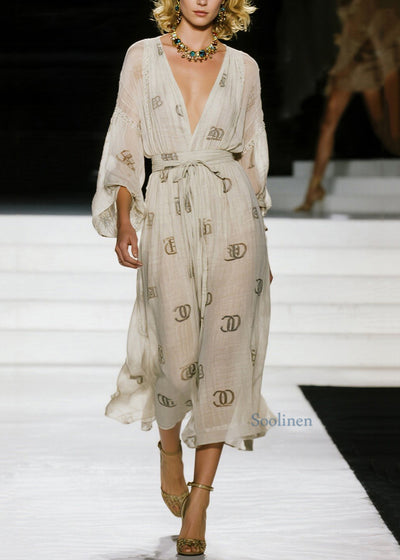 Natural Beige V Neck Patchwork Cotton Maxi Dresses Fall