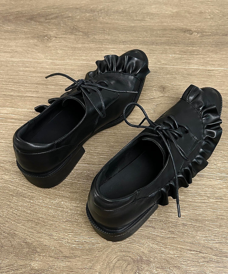 Original Design Black Ruffled Lace Up Splicing Flat Feet Shoes