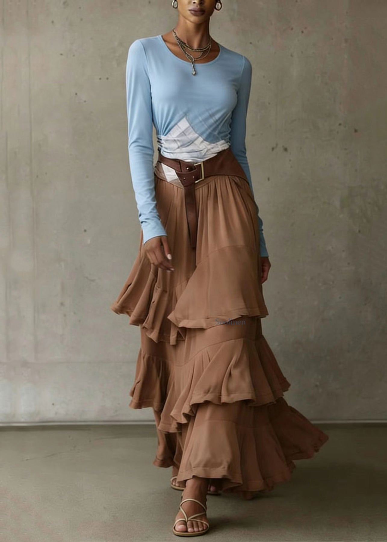 French Coffee Asymmetrical Ruffled Patchwork Chiffon Skirt Spring