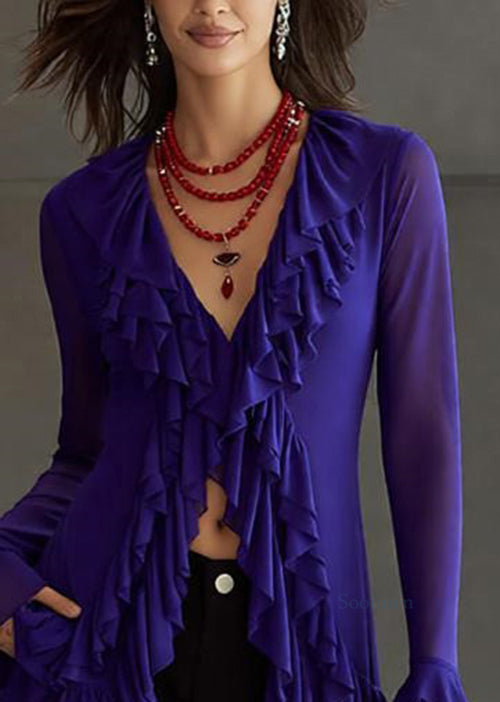 Slim Fit Purple V Neck Ruffled Solid Tulle Top Flare Sleeve