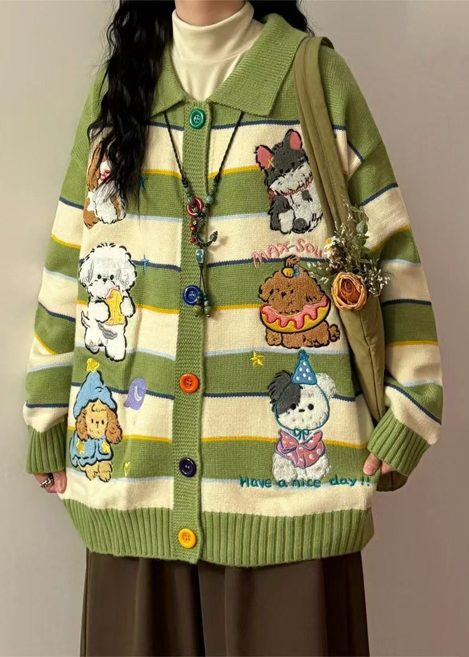 Casual Green Embroidered Striped Knit Coats Spring