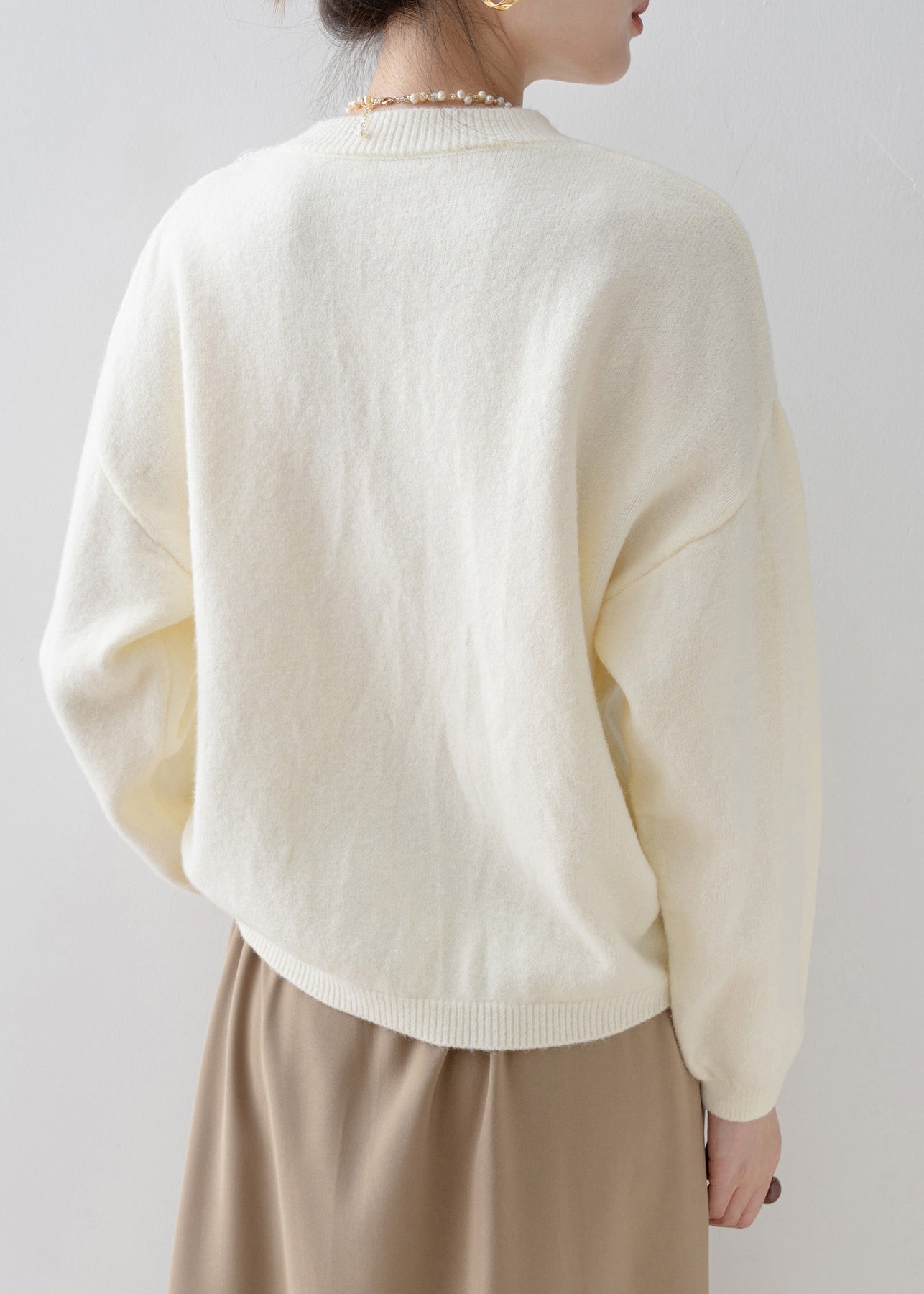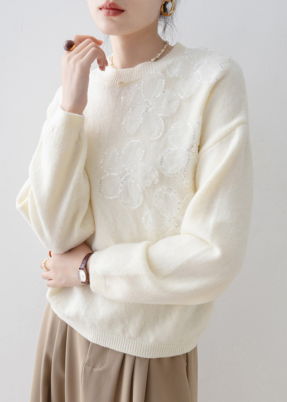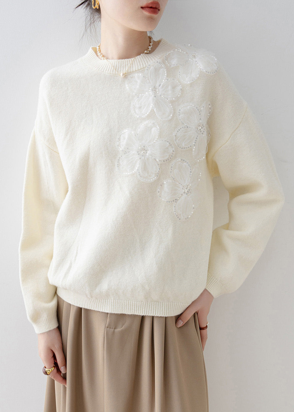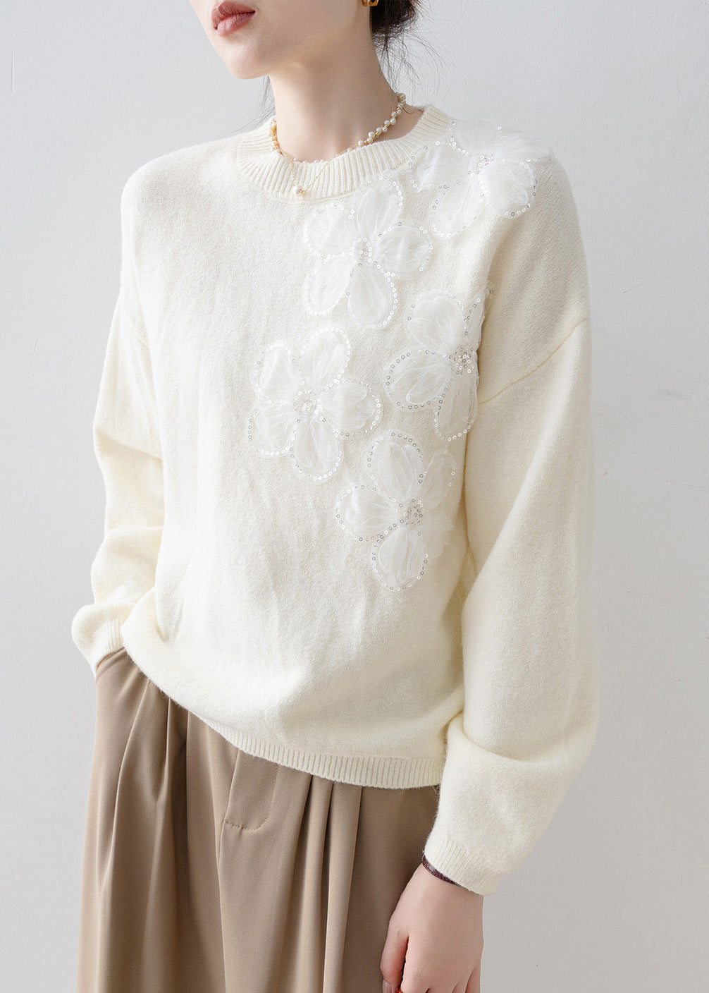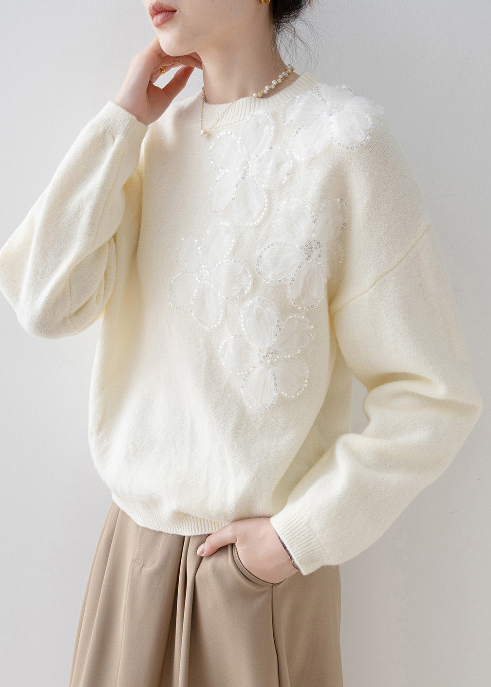 French White O Neck Floral Sequins Knit Sweater Tops Spring