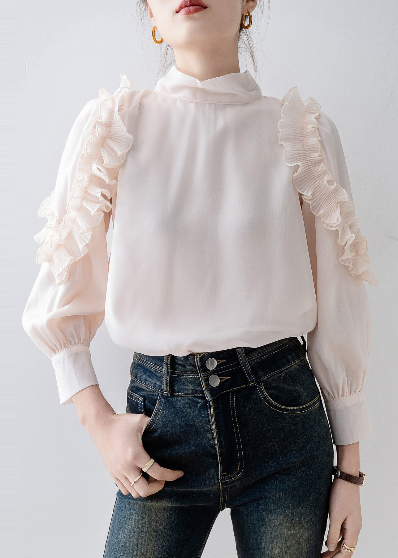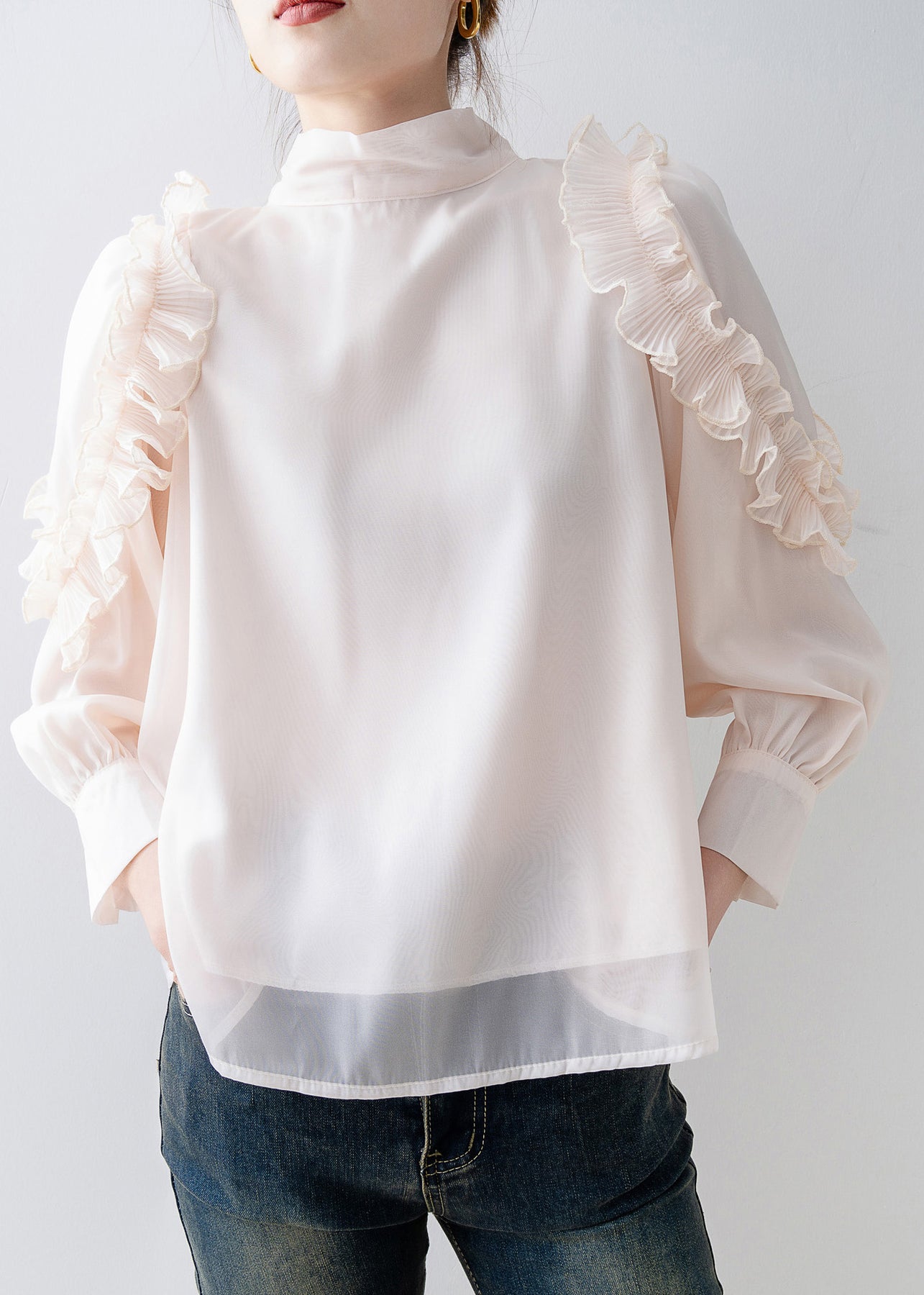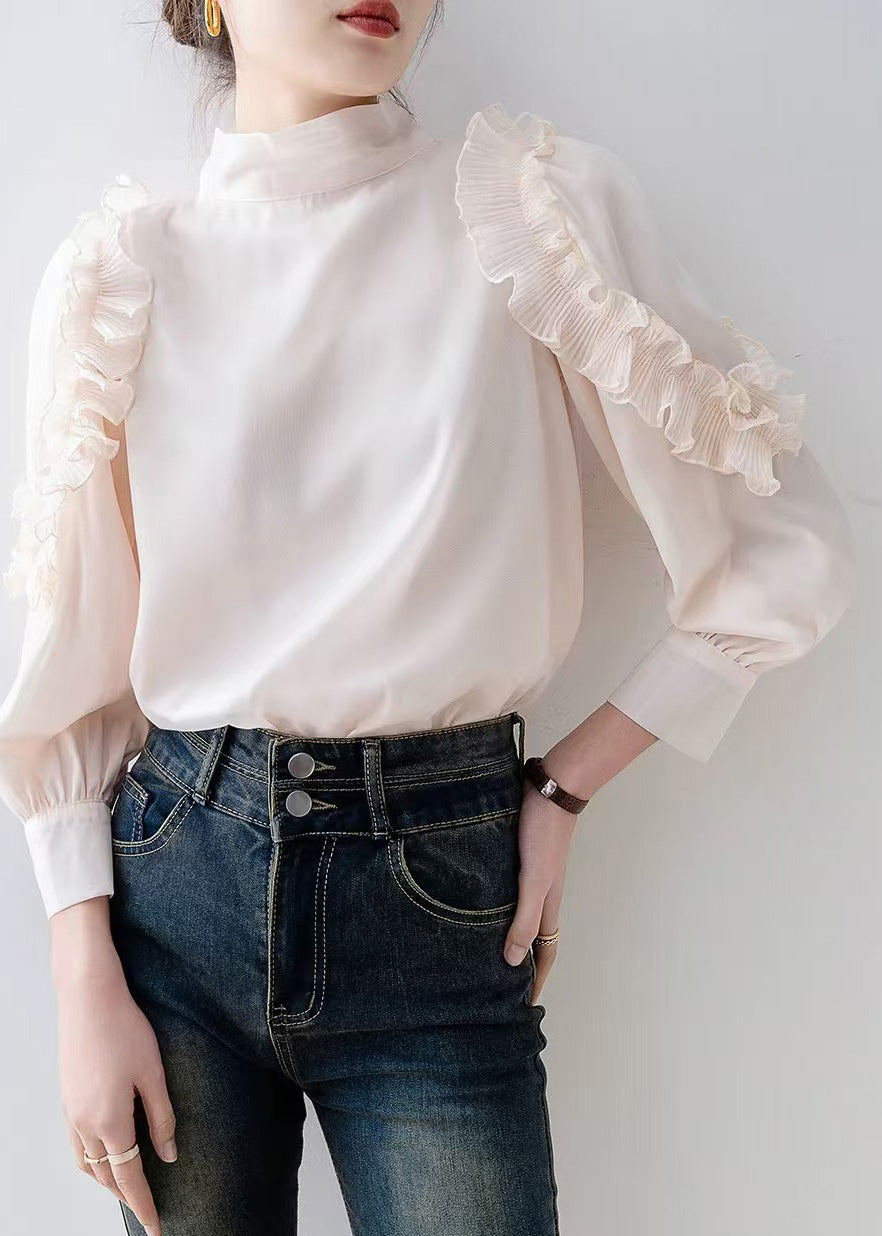 Beautiful Apricot Stand Collar Ruffled Chiffon Top Spring