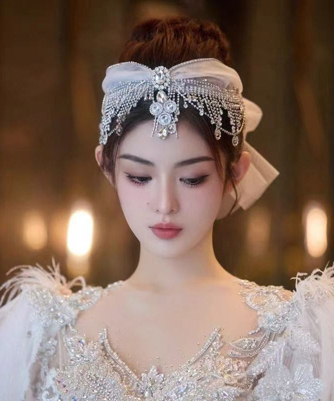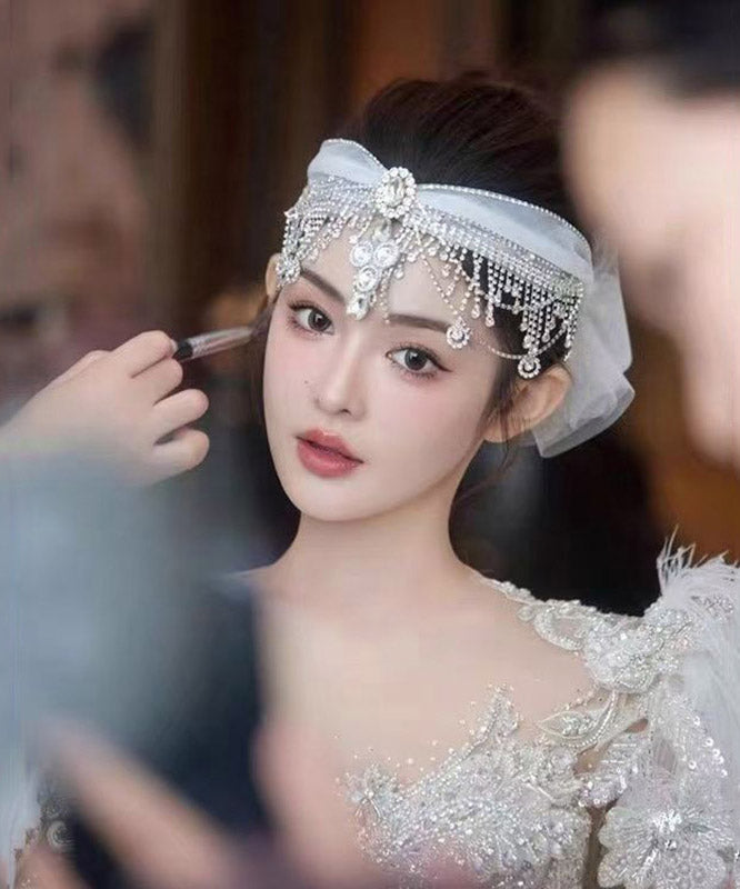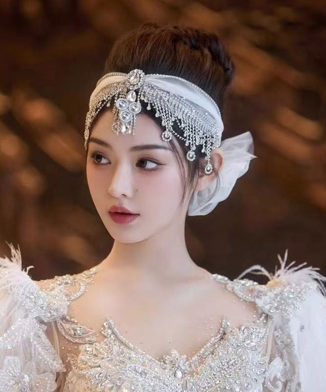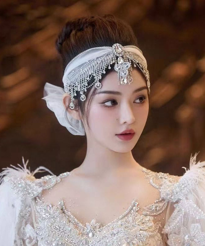 Art White Tulle Patchwor Crystal Zircon Tassel HairPiece