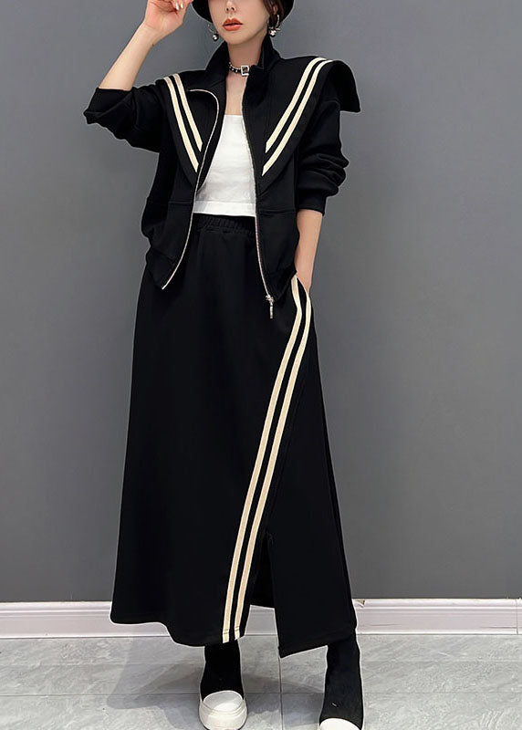 Art Black Sailor Collar Zip Up Side Open Cotton Two Pieces Set Fall