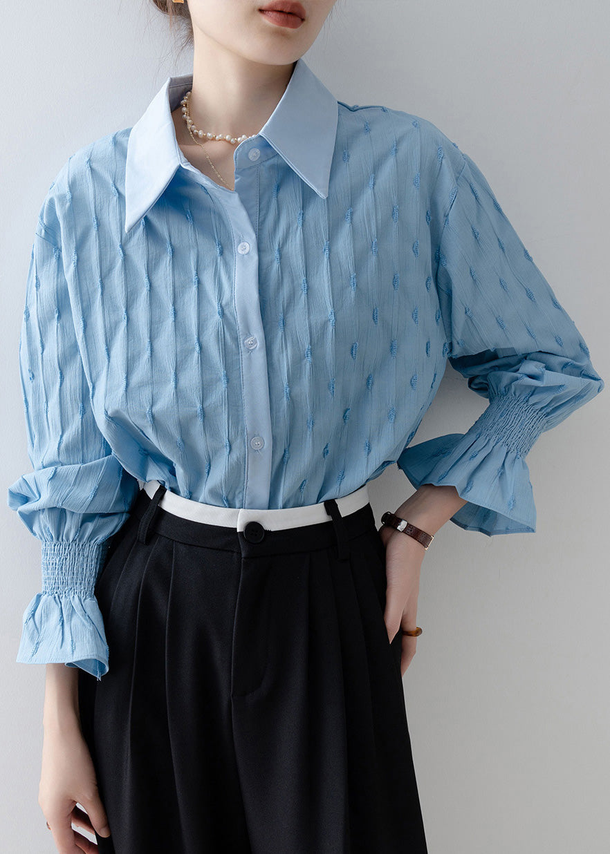 French Sky Blue Embroidered Striped Cotton Shirt Tops Flare Sleeve