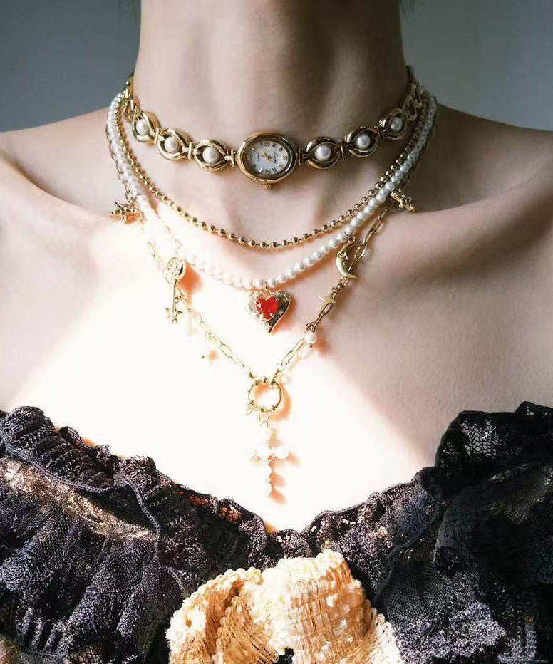 Stylish Gold Clock Love Pearl Layering Titanium Steel Two Piece Set Pendant Necklace