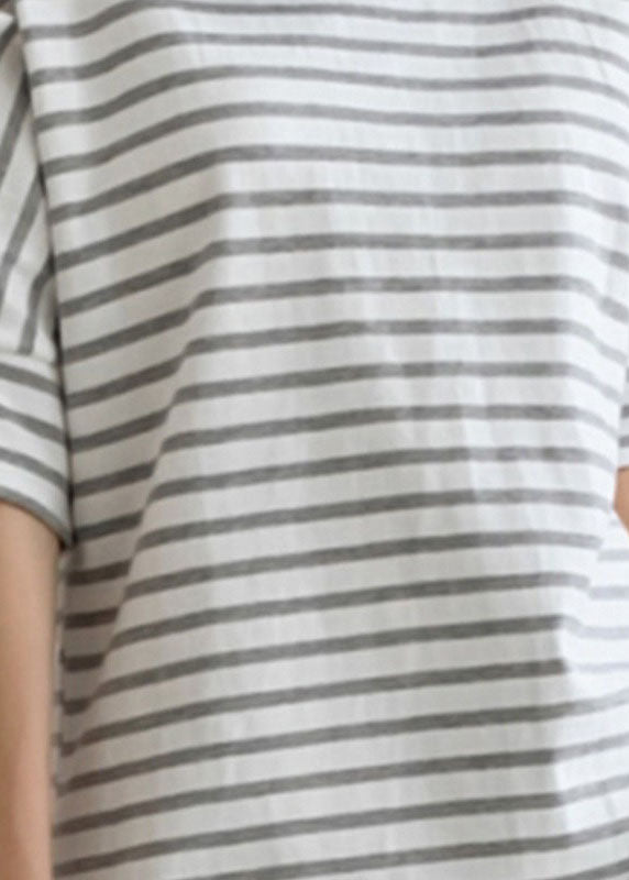 DIY Grey Striped O Neck Cotton T Shirt Tops Puff Sleeve