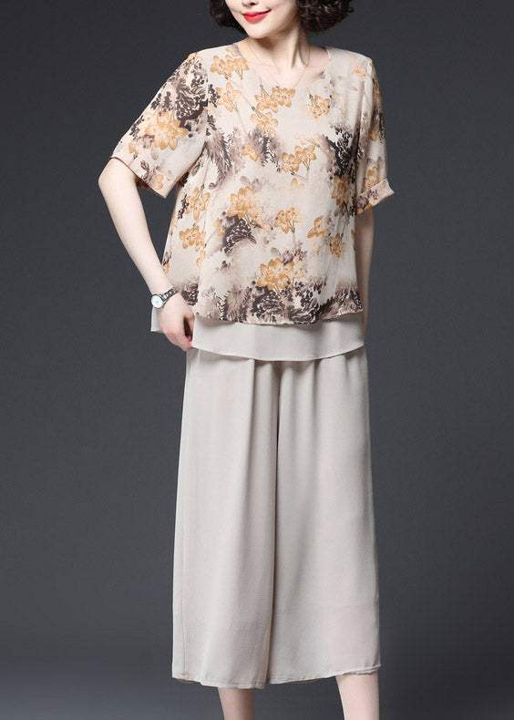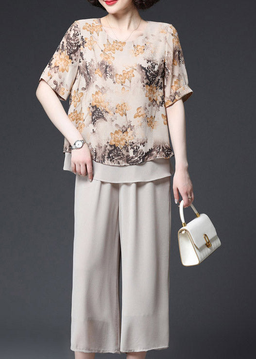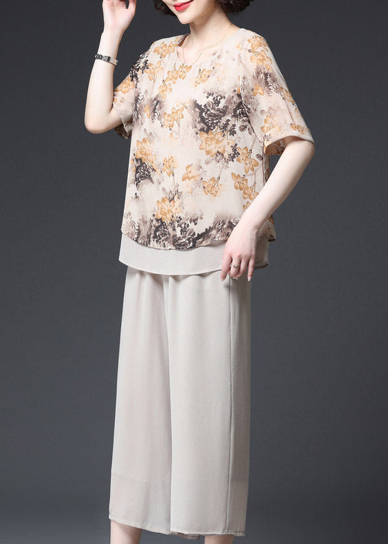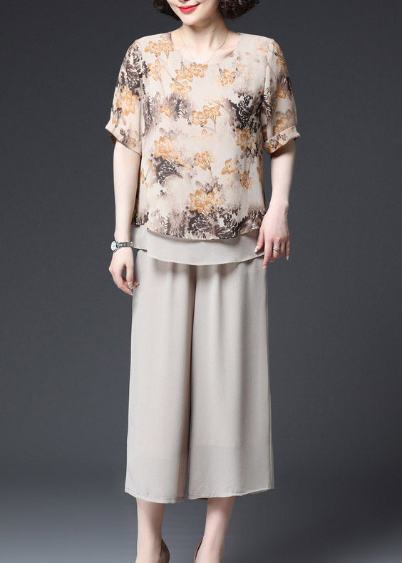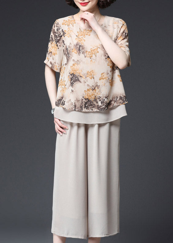 Fashion Apricot O-Neck Print Layered Design Chiffon Tanks und Hose mit weitem Bein Zweiteiliges Set Sommer