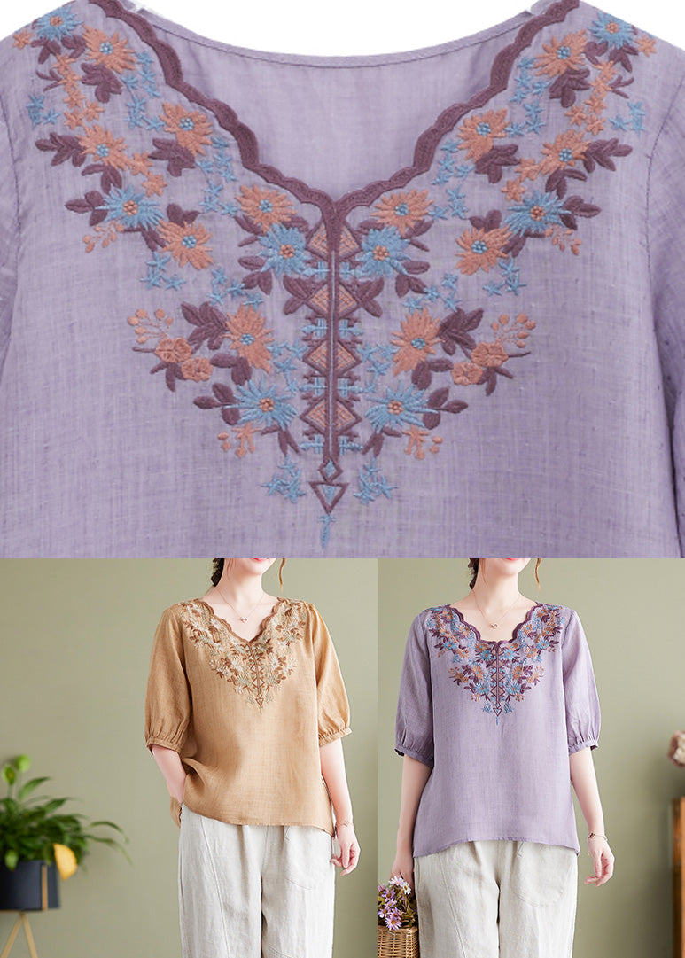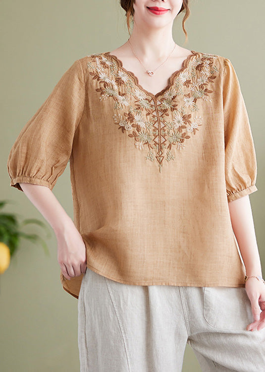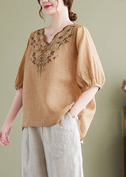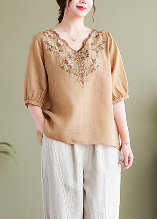 Khaki V Neck Solid Cotton T Shirt Half Sleeve