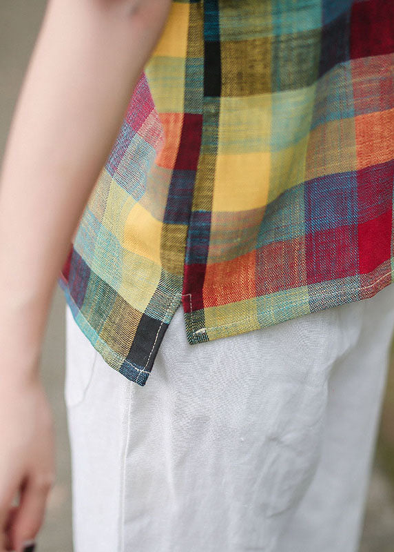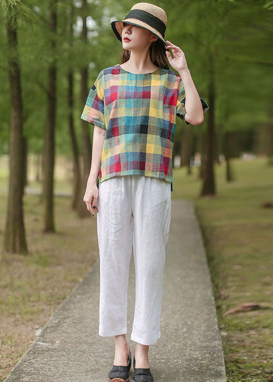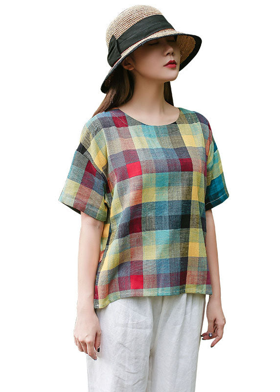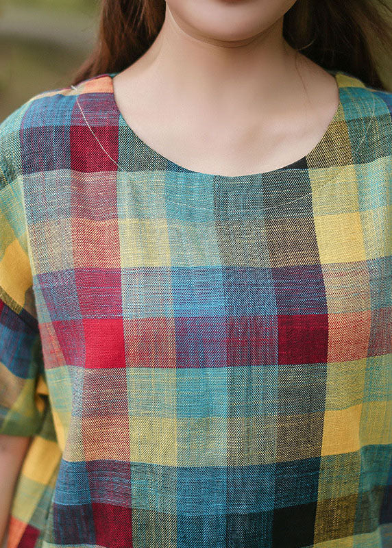 Style Gelbes kariertes Baumwolltop mit O-Ausschnitt und kurzen Ärmeln