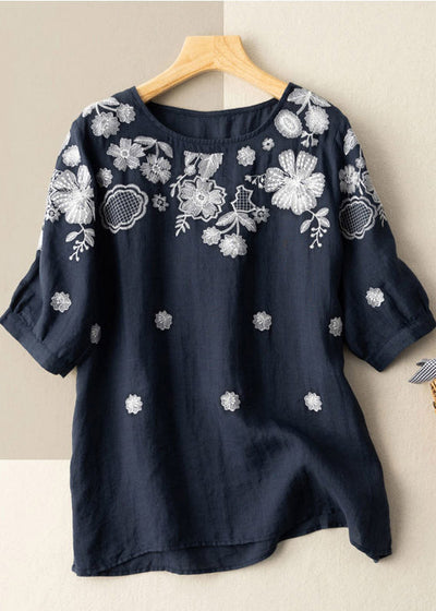 Boutique Navy O-Neck Besticktes Blumen-Baumwollhemd mit kurzen Ärmeln