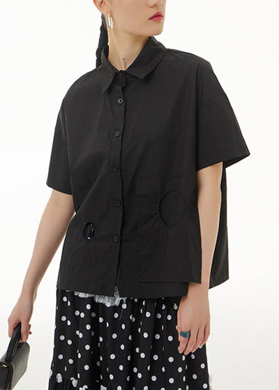 Black Patchwork Solid Cotton Shirt Short Sleeve